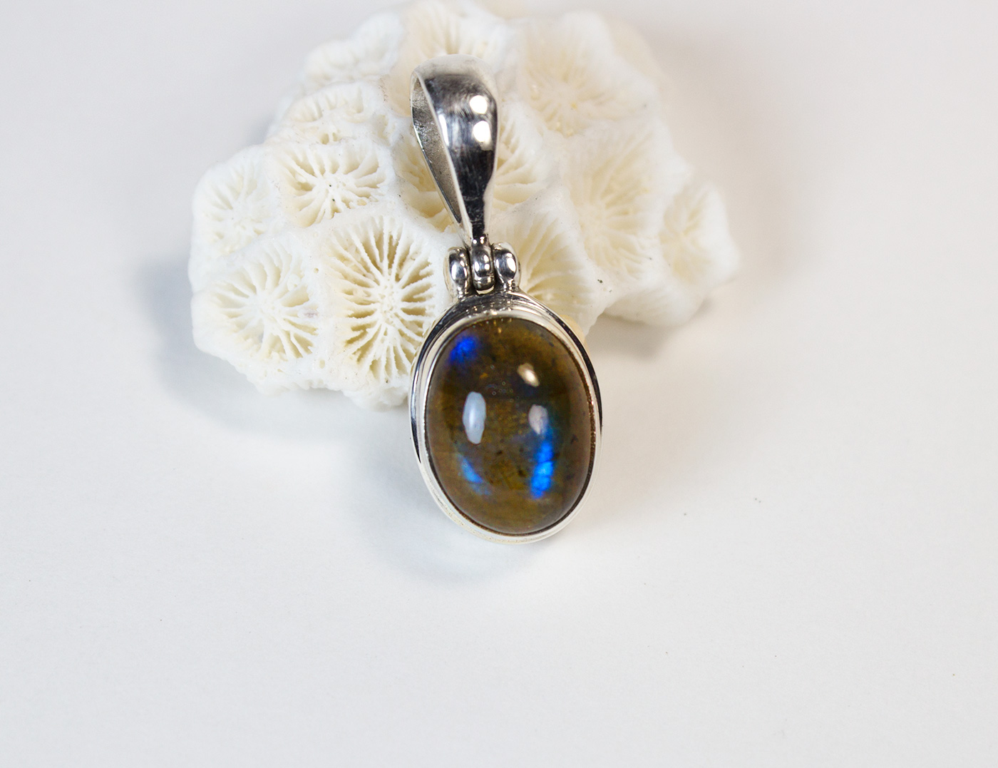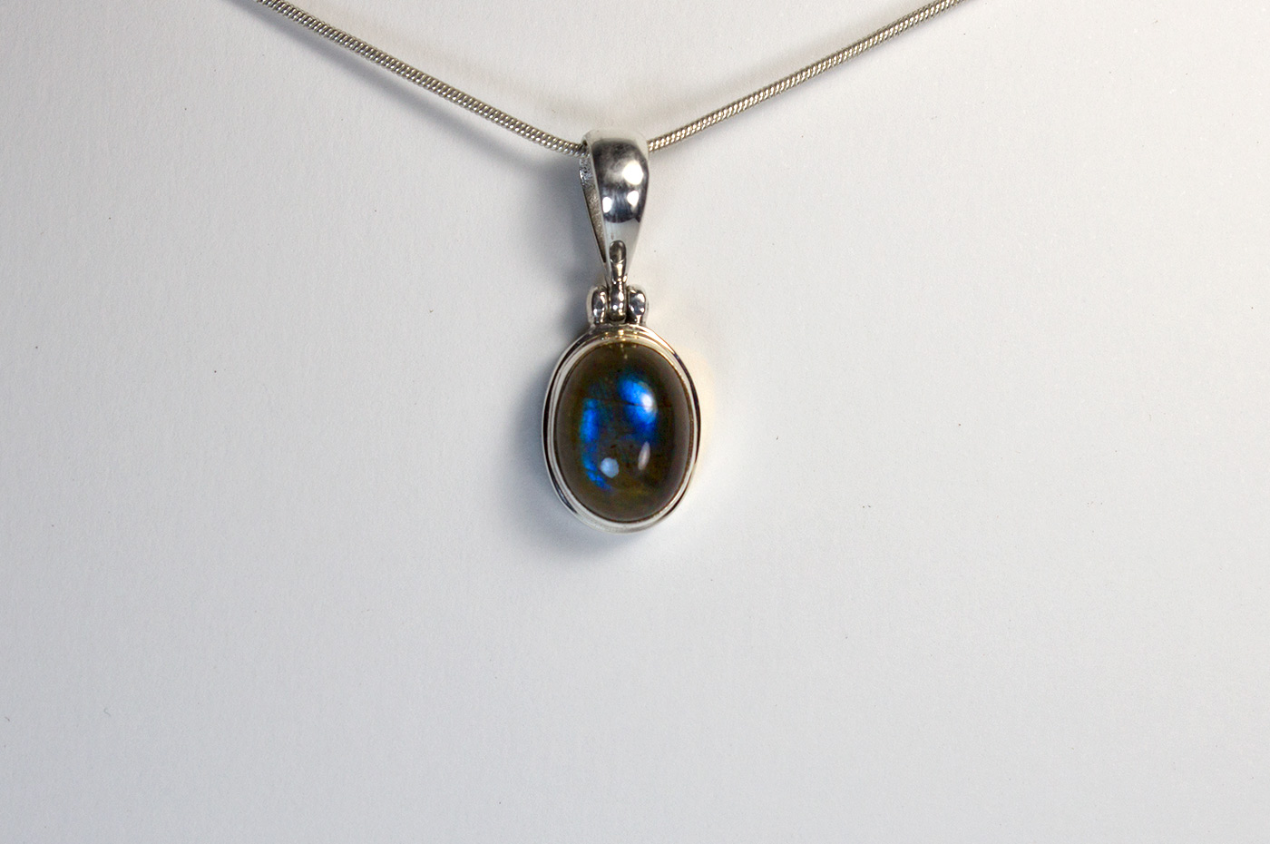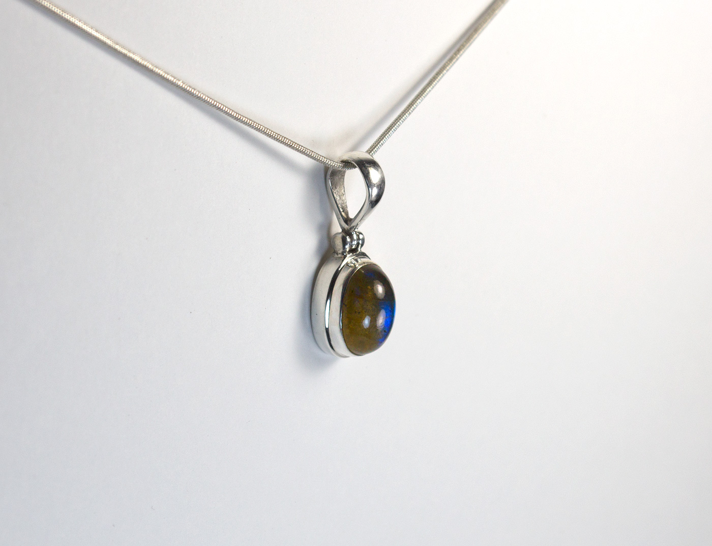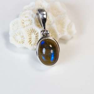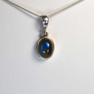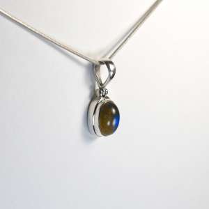 Colgante de labradorita ovalado y plata de ley 925. La labradorita tiene una iridiscencia azul y verde. El largo total del colgante incluída la anilla es de 3 cm.
