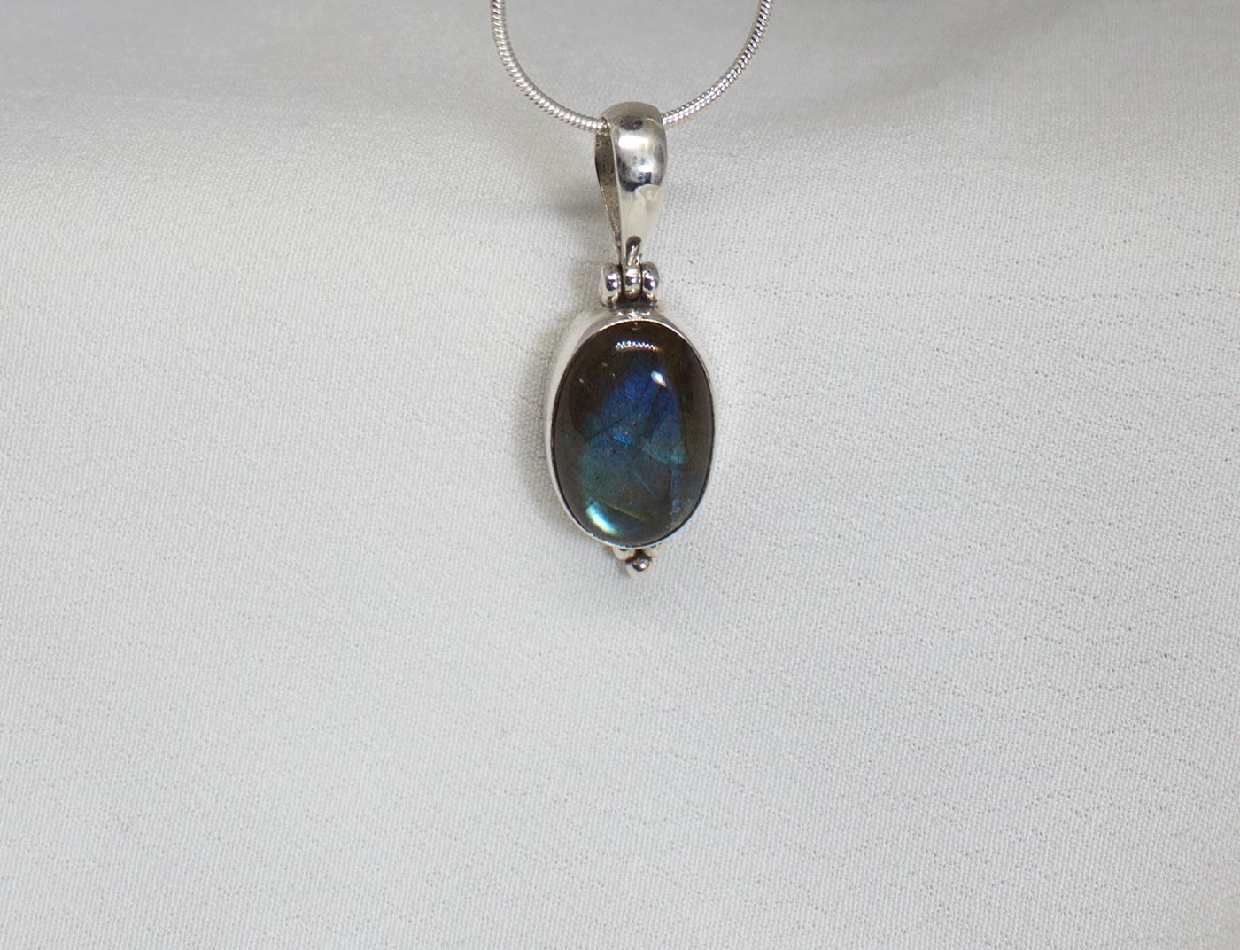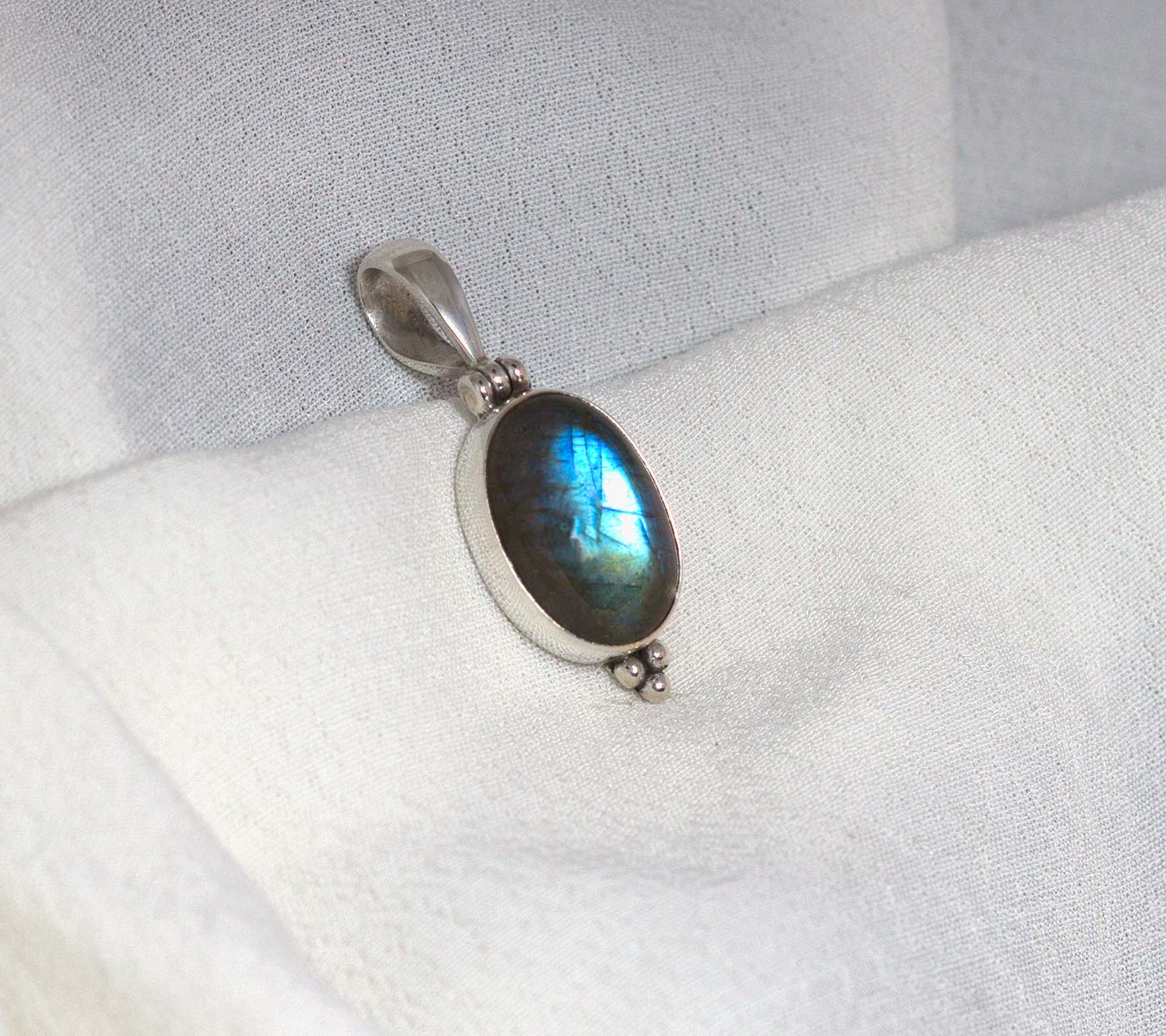 Colgante de labradorita y plata de ley 925. La labradorita tiene forma ovalada y con fuertes reflejos azules. La piedra mide 1,8 cm de largo por 1,6 cm. El tamaño del colgante con la anilla es de 3,6 cm.