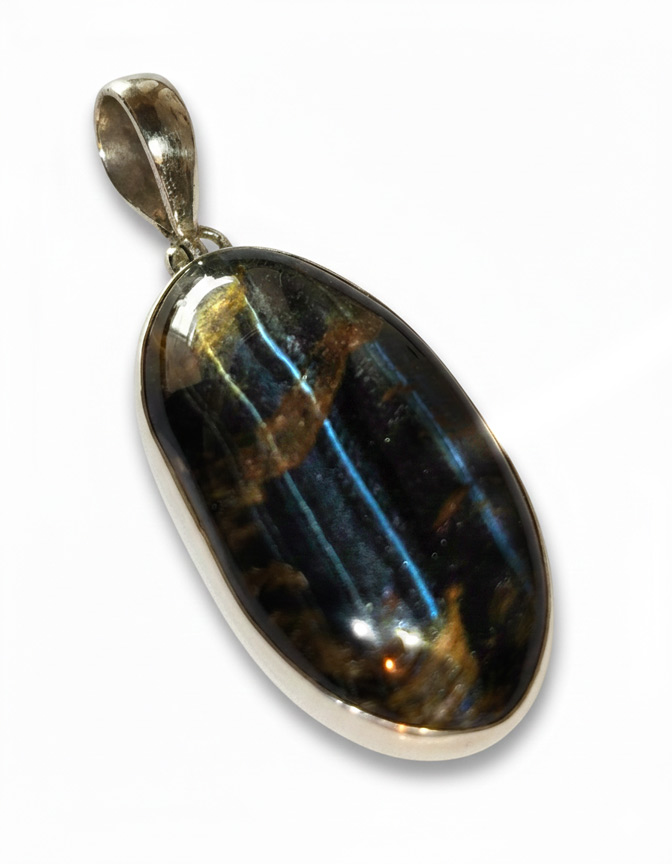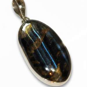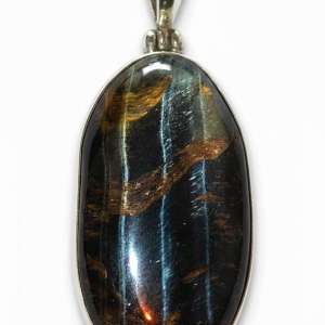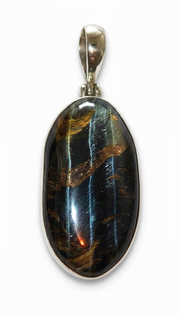 Colgante de ojo de halcón elaborado en plata de ley 925. El colgante tiene una factura clásica, y lleva engarzado un ojo de halcón ovalado.  La joya es lisa dando protagonismo a la piedra. Esta tiene un precioso reflejo, con líneas verticales cambiantes. El tamaño total del colgante es de  5 cm de largo incluida la anilla, y 2 cm de anchura. Está fabricado en modo artesanal.