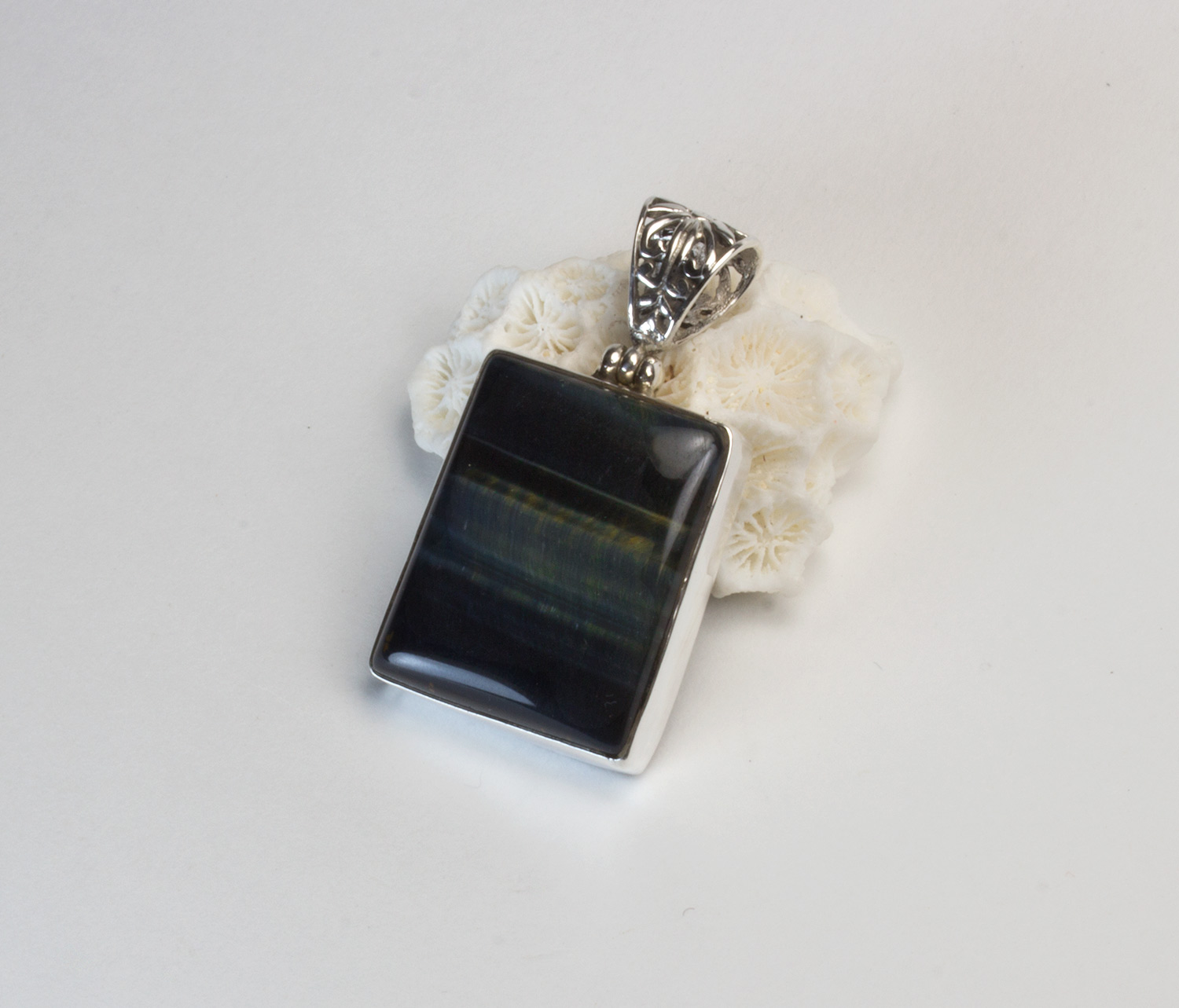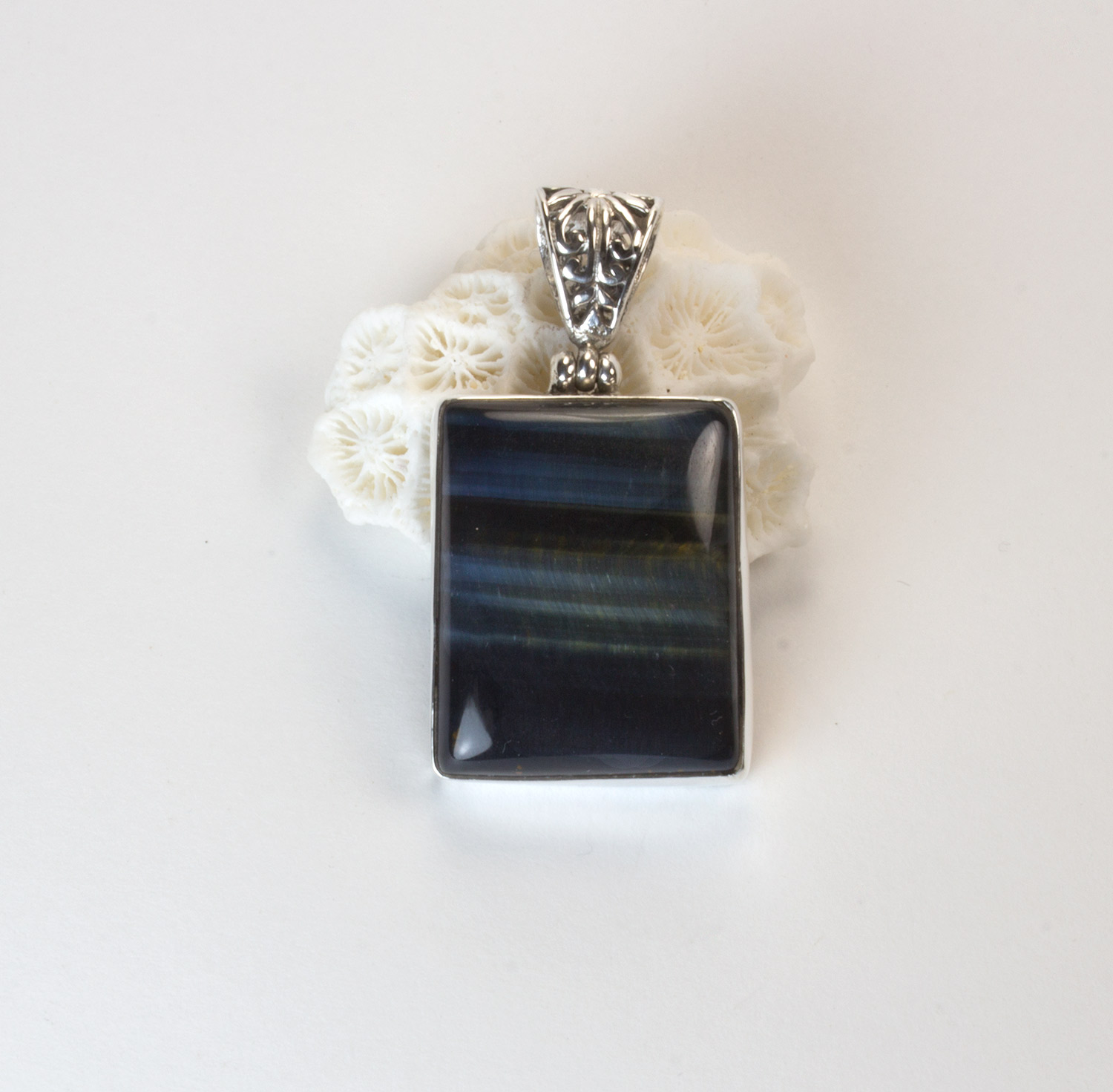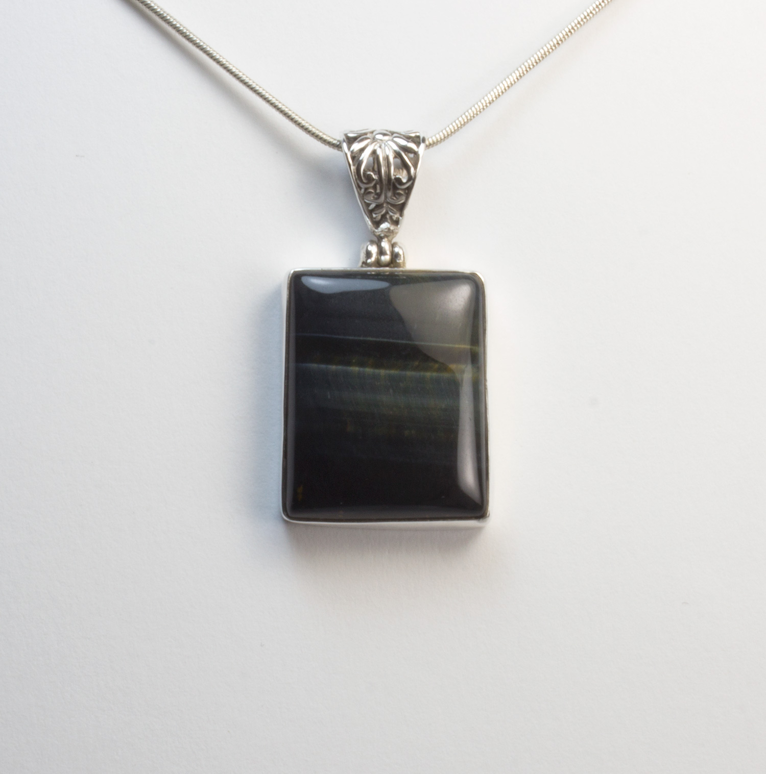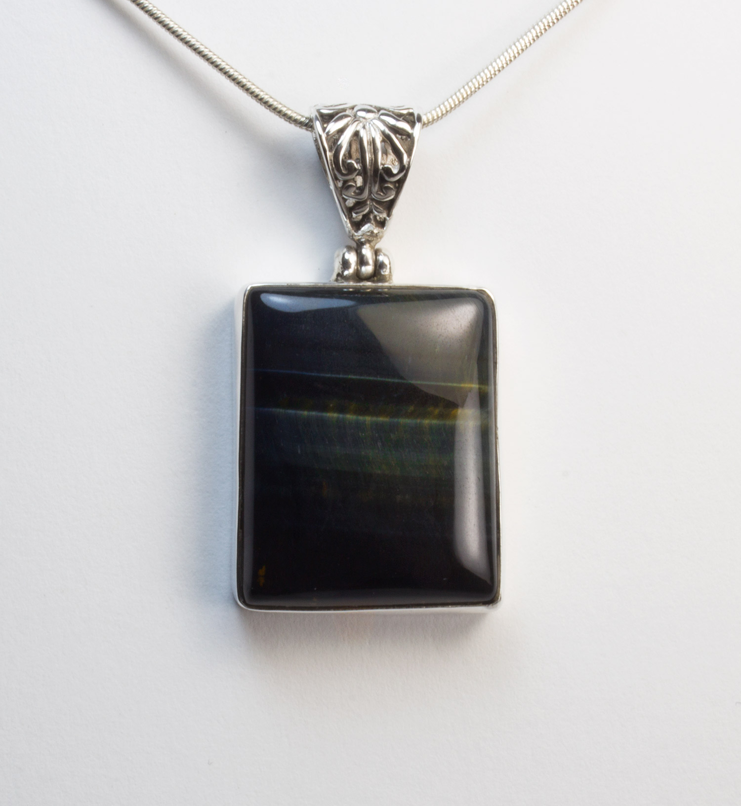 Colgante de ojo de halcón con plata 925. Colgante rectangular con una bonita anilla trabajada con filigrana. Lleva un ojo de halcón engarzado de color azul-grisaceo oscuro con bandas verdes y grises. Mide 2,6 por 2 cm. El largo total con la anilla es de 4cm.