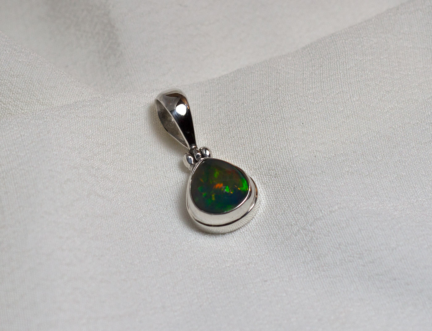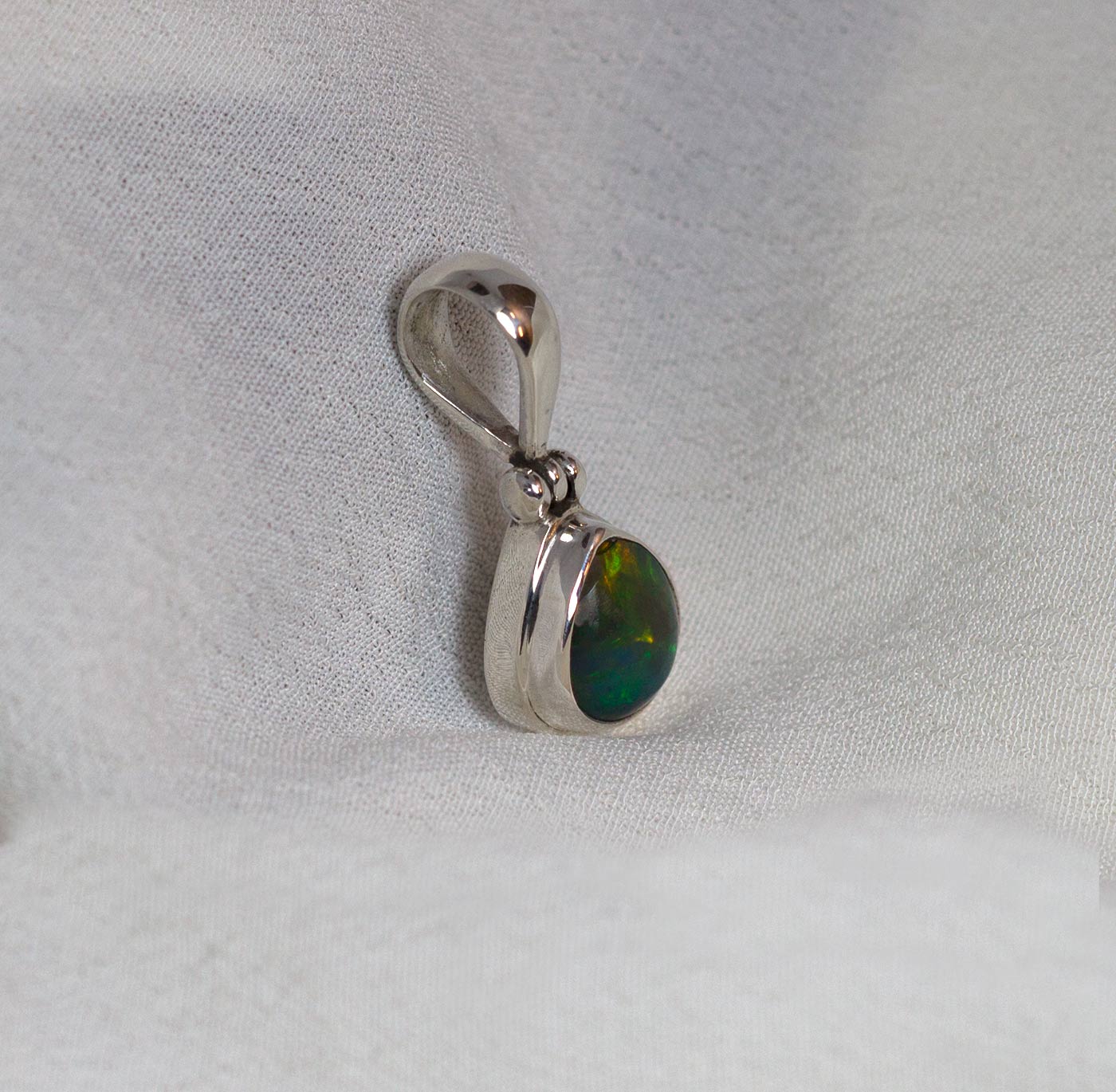Colgante de plata de ley 925 con opalo negro en forma de corazón. El ópalo tiene una gran opalescencia con reflejos verdes y rojizos. La piedra proviene de Etiopía. Tiene un tamaño de 1 cm de largo por 0,9 en la parte más ancha. El largo total del colgante es de 2,7 cm