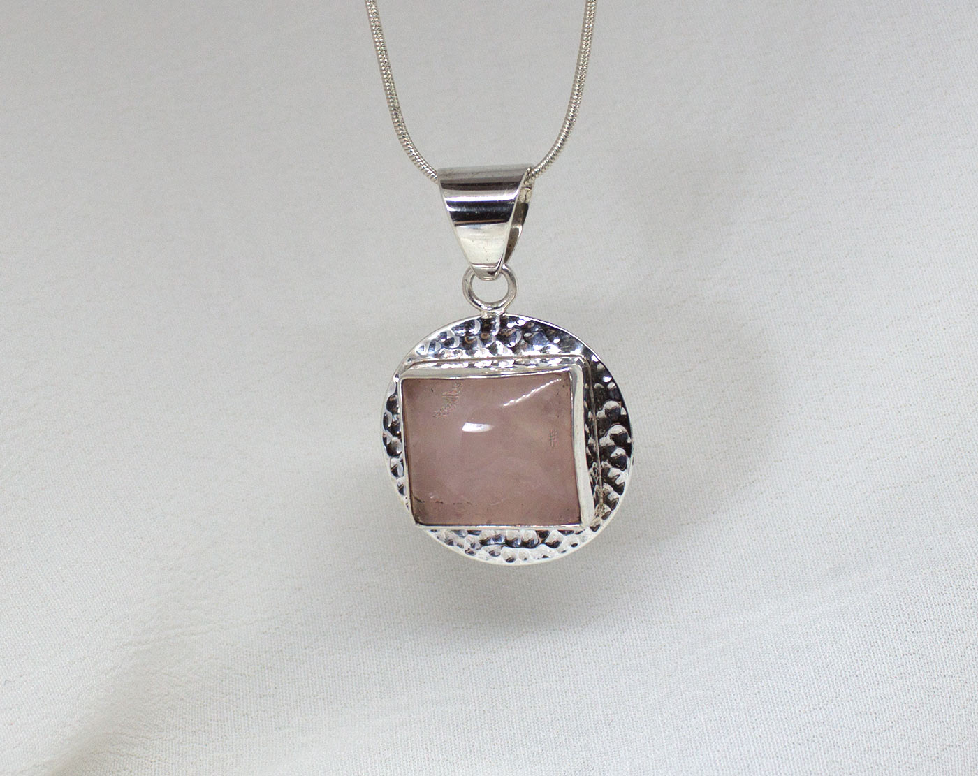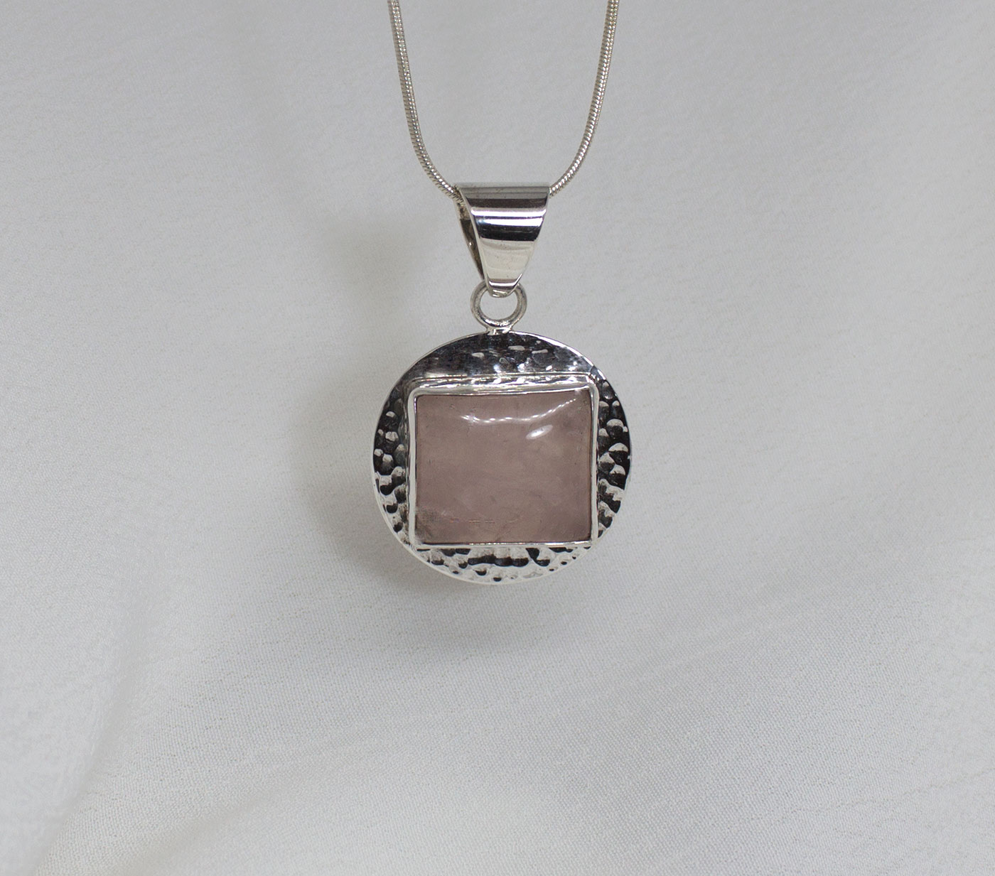 Colgante de plata de ley 925 con cuarzo rosa. Es unEl cuarzo rosa es de forma rectangular de 1,8 por 1,6 cm de lado. colgante redondo de 2,2 cm de diámetro y una textura martelada. Es una piedra que trabaja con el chacra del corazón, y su significado principal es el amor y la armonía. El largo total del colgante es de 4,2 cm. Está elaborado artesanalmente.