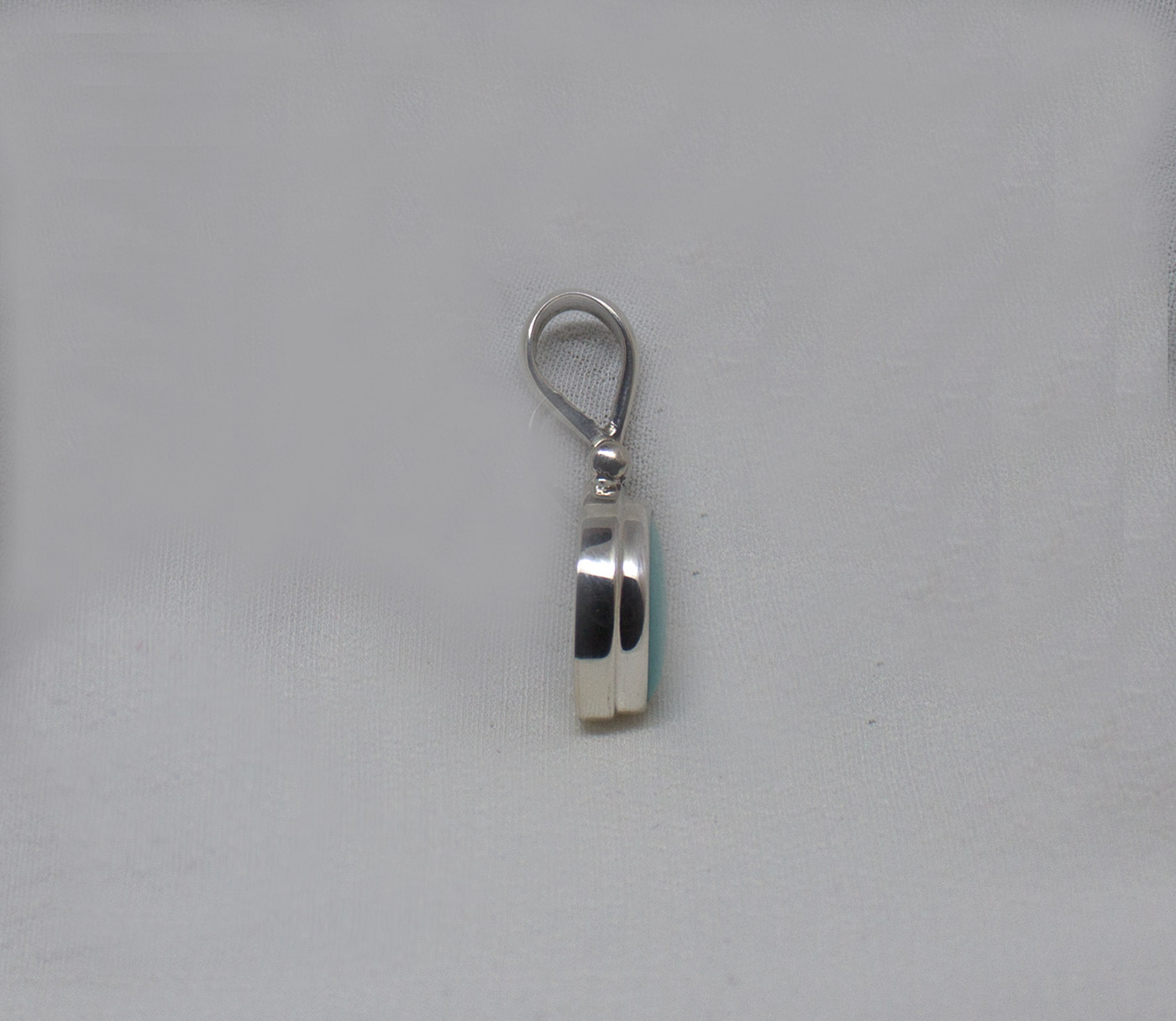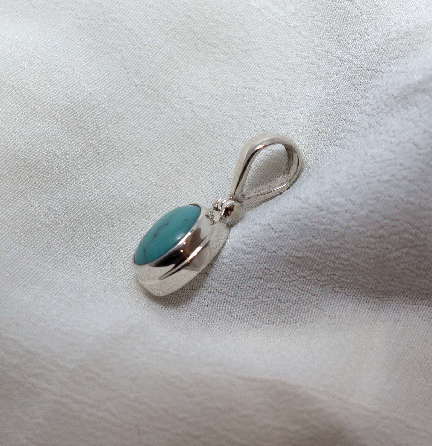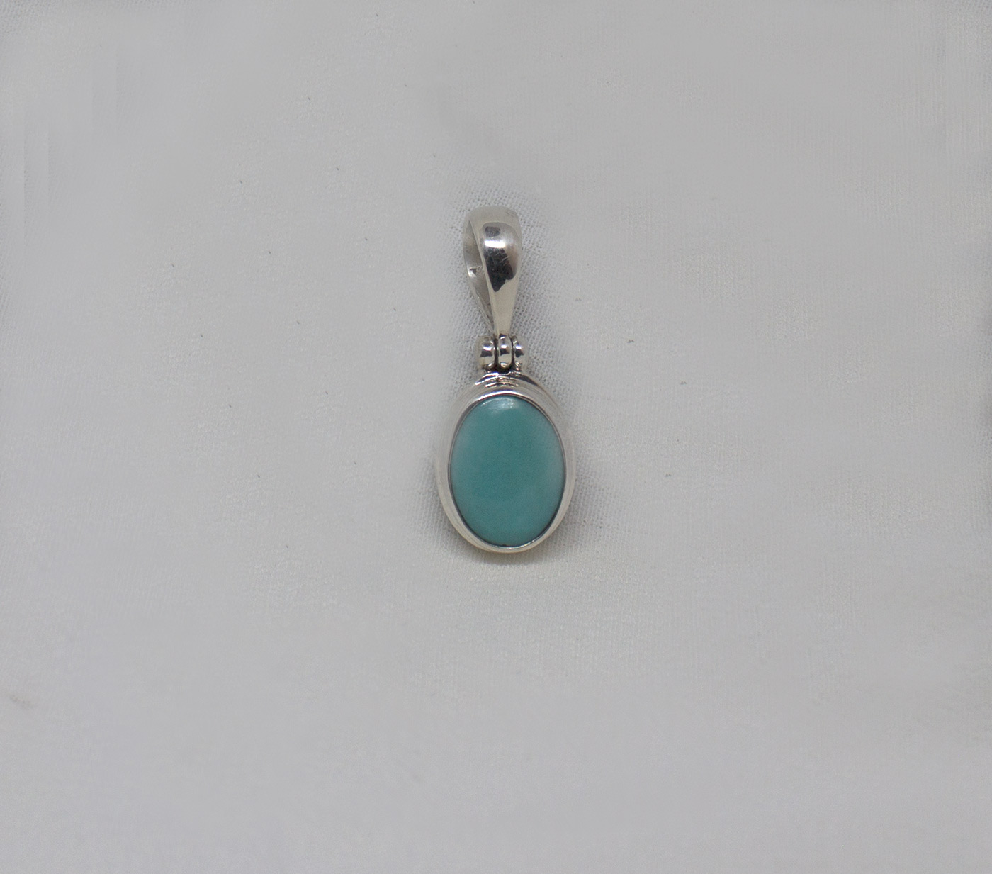 Colgante de turquesa y plata de ley 925. Lleva una turquesa engarzada de color azul cielo claro. Su tamaño es de 1,9 cm por 1cm. El largo del colgante incluida la anilla es de 3 cm.