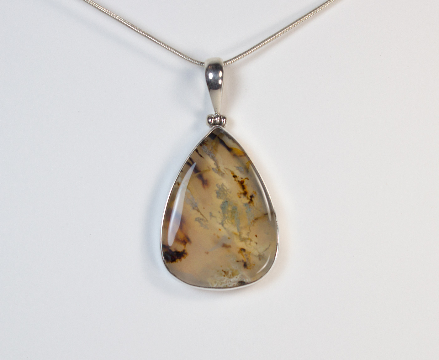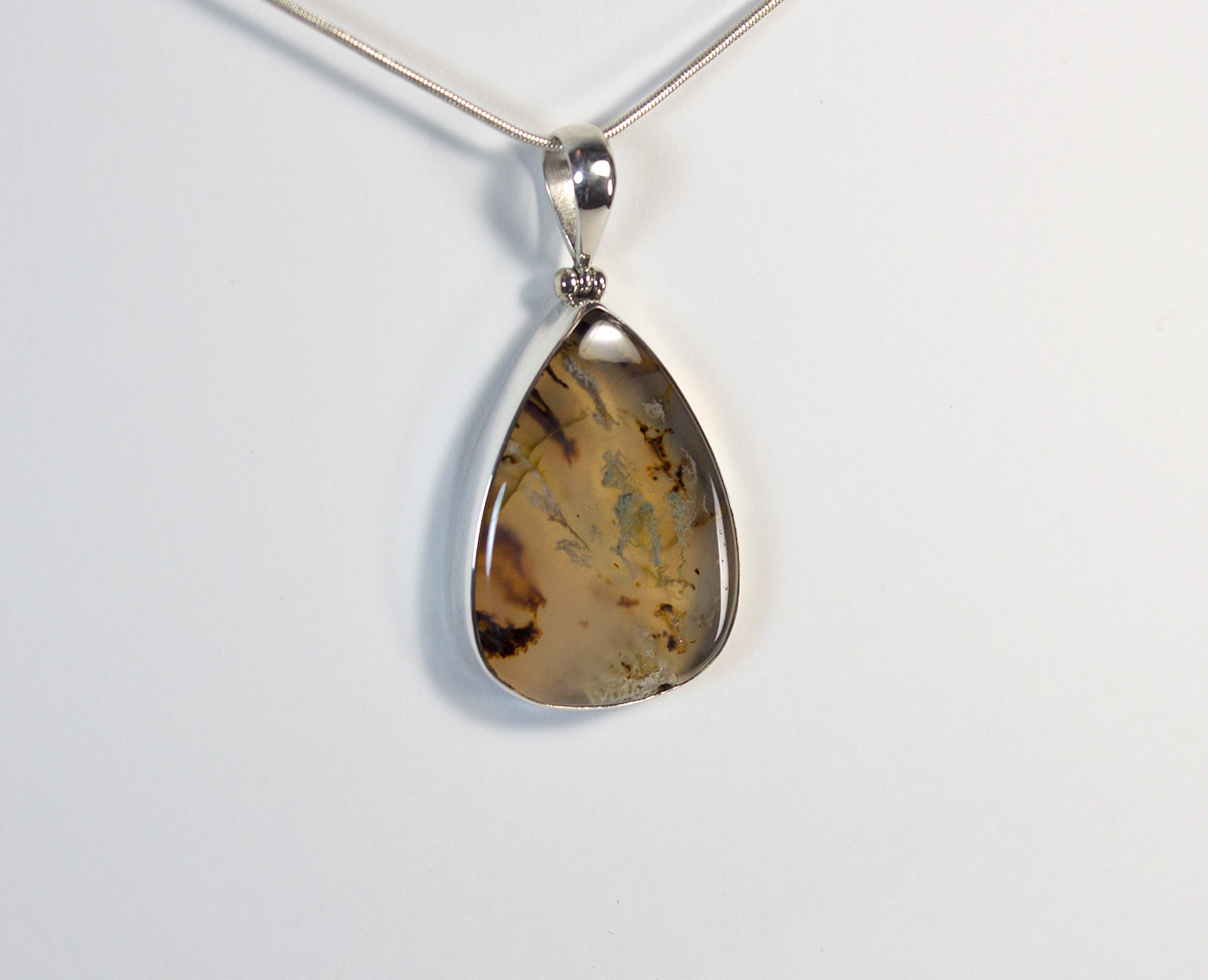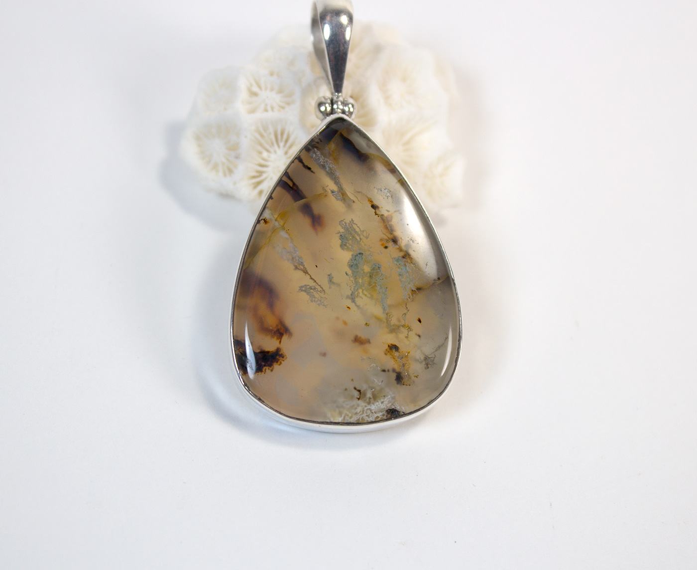 Colgante en agata montana con plata de ley 925. Este colgante lleva engarzado un ágata montana en forma de lágrima. El ágata montana se forma como resultado de erupciones volcánicas y flujos masivos de lava en el área del Parque de Yellowstone. El ágata de Montana se forma a partir de la calcedonia, uno de los muchos tipos de cuarzo. La calcedonia tiene un brillo ceroso y puede ser semitransparente o translúcida. Los efectos de helechos, de árboles, arbustos y escenas de montaña provienen de pequeños canales dentro de las piedras que dejan que el agua cargada de minerales se filtre en la piedra desde hace siglos creando estas maravillosas escenas. Tiene 3.6 por 2,6 cm. La parte posterior viene totalmente cerrada con plata y el largo total del colgante es de 5,1 cm. Está elaborado en modo artesanal.