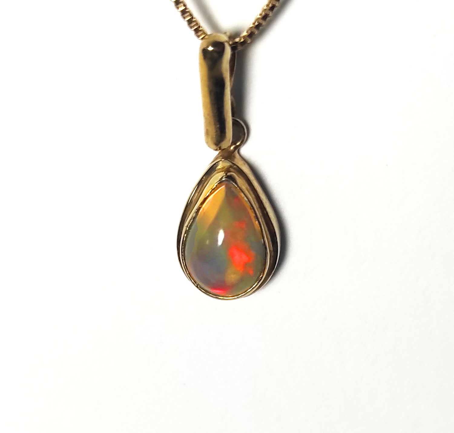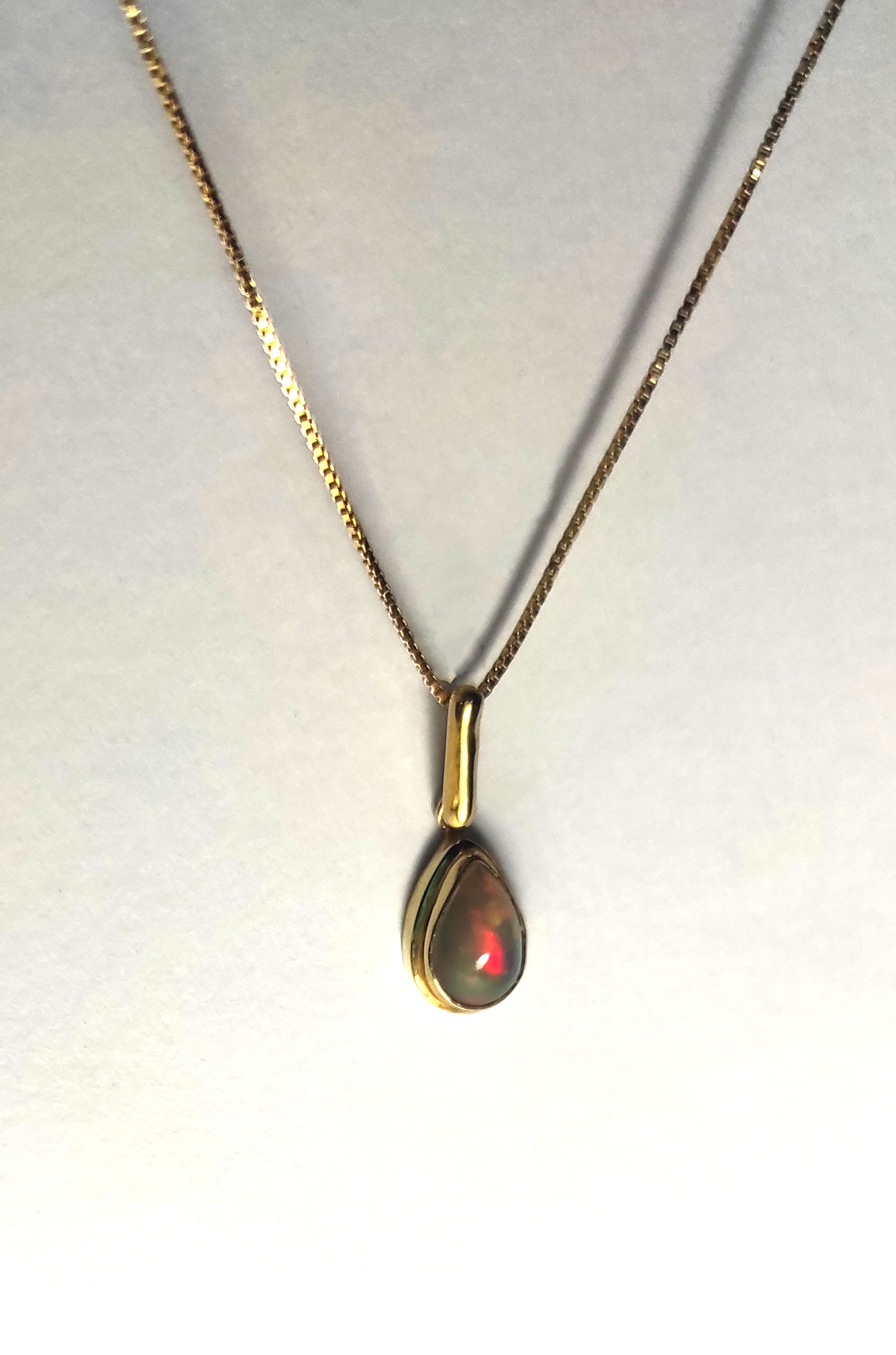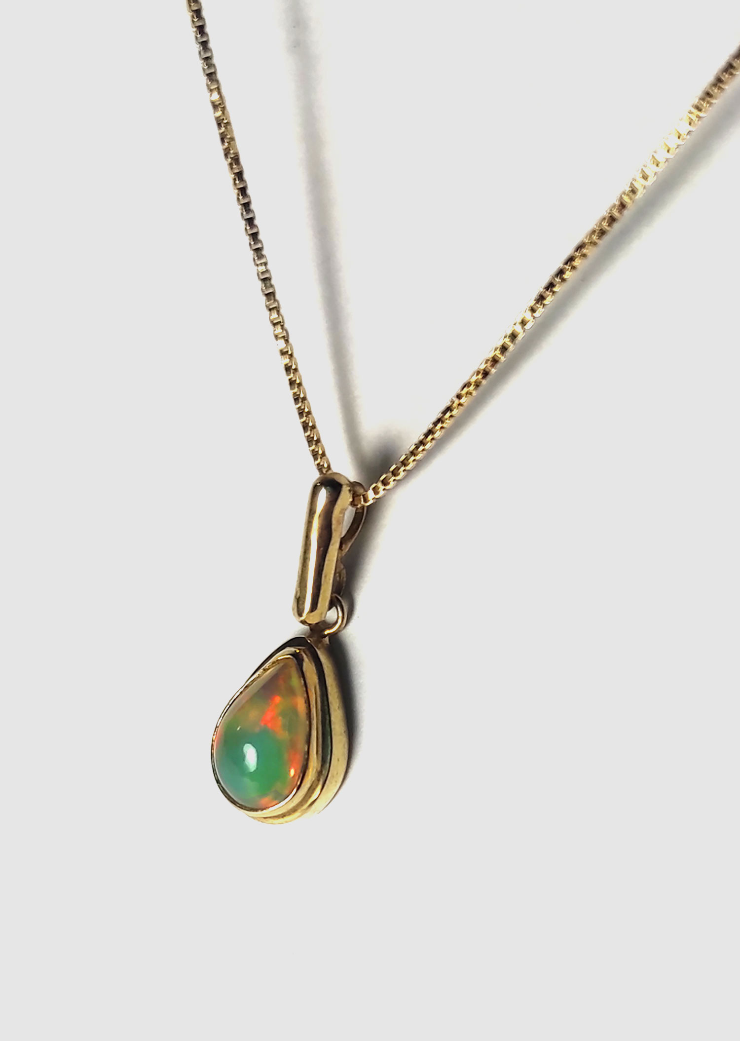 Colgante en oro y ópalo en forma de lágrima. El colgante y la cadena son de plata de ley 925 y con un baño en oro de 18 quilates. Lleva un ópalo de 9,45 por 6,25mm engarzado en forma de lágrima y con reflejos rojos y verdes. La cadena es de 45cm. y puede cambiarse si se desea por otra de menor tamaño.