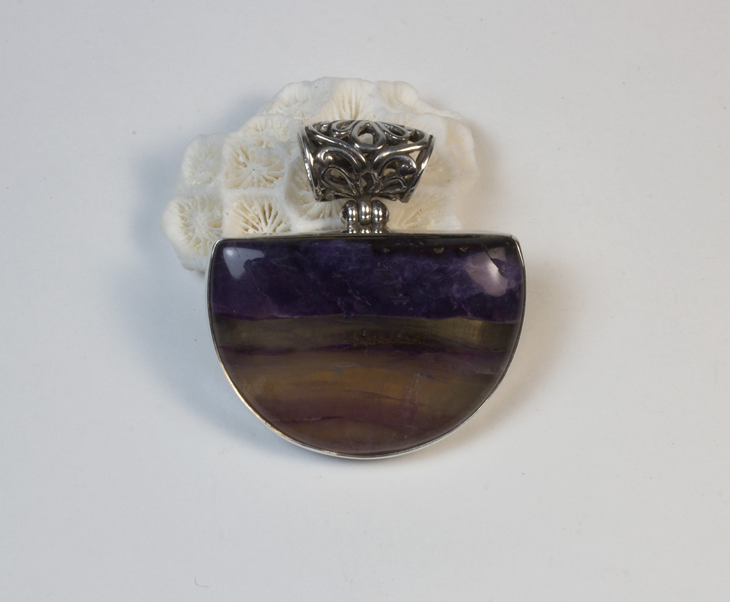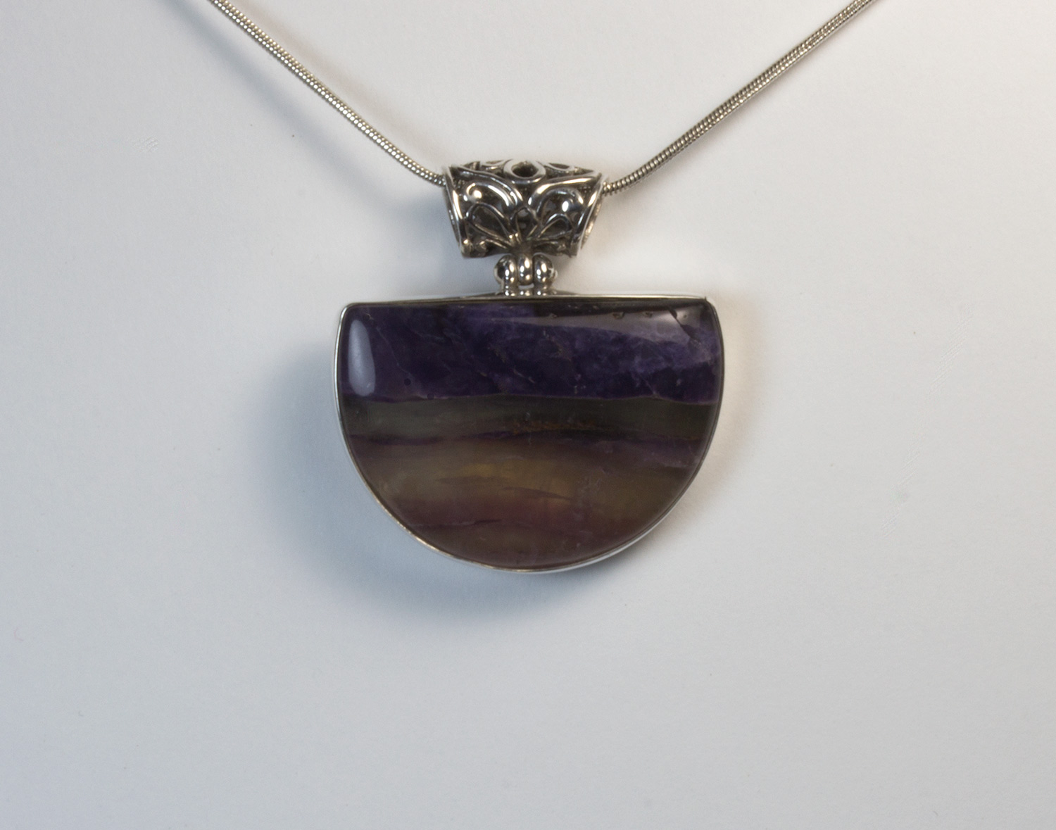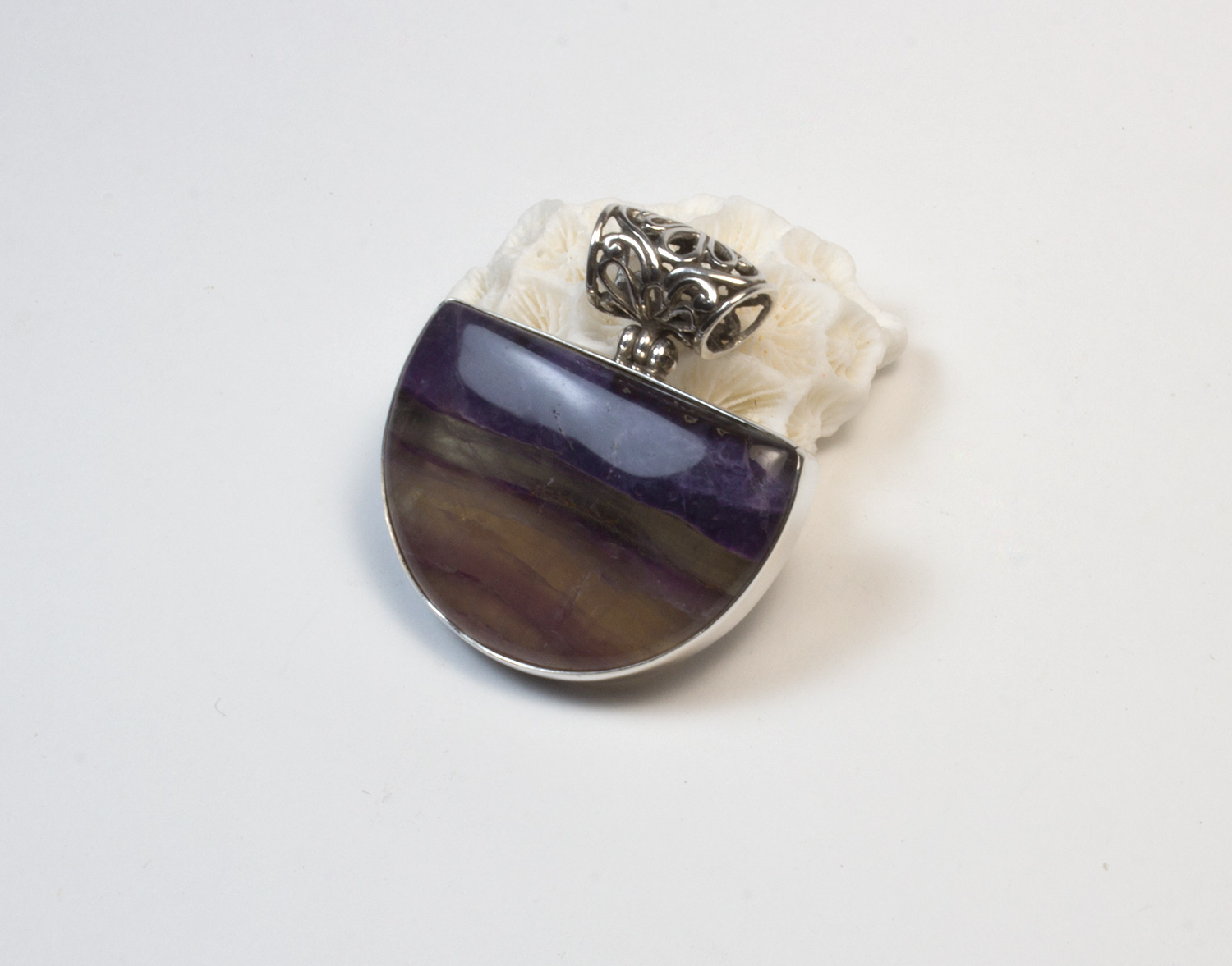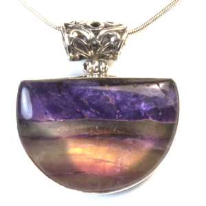 Colgante en plata de ley 925 con fluorita. La piedra tiene forma de media luna con tonalidades quevan desde el violeta oscuro al rosa palo. Tiene un tamaño de 3,5 cm de largo por 3,3 en su parte más ancha. Lleva una anilla finamente labrada. Está elaborado en modo artesanal.