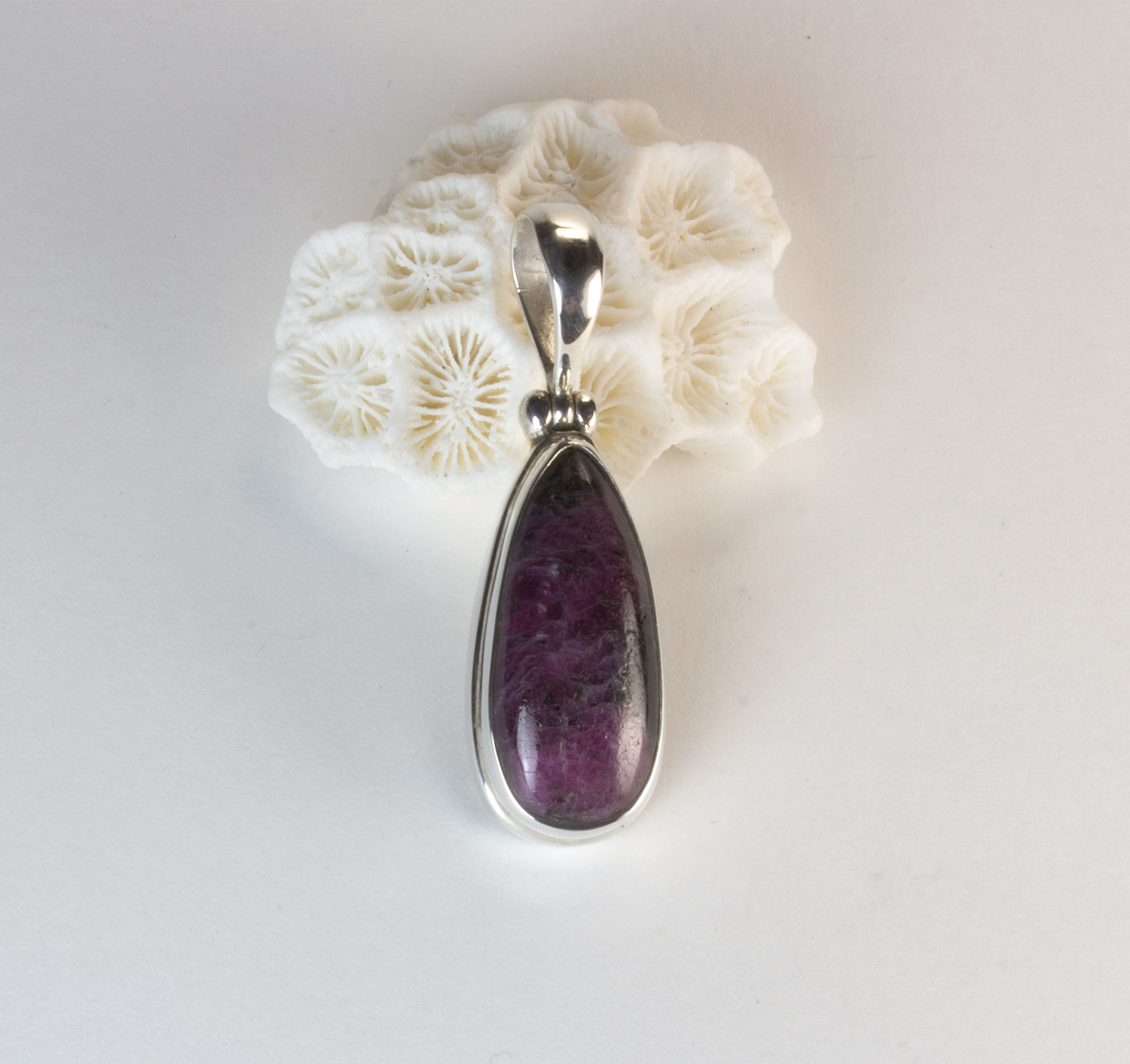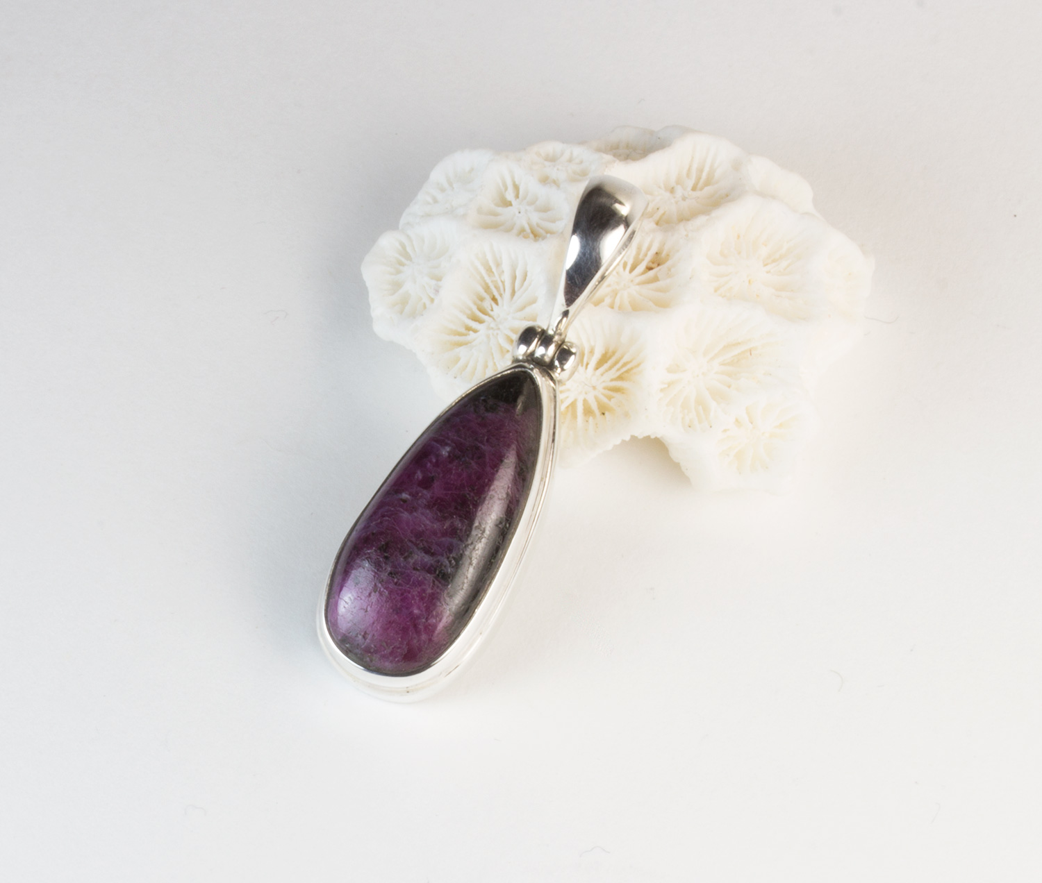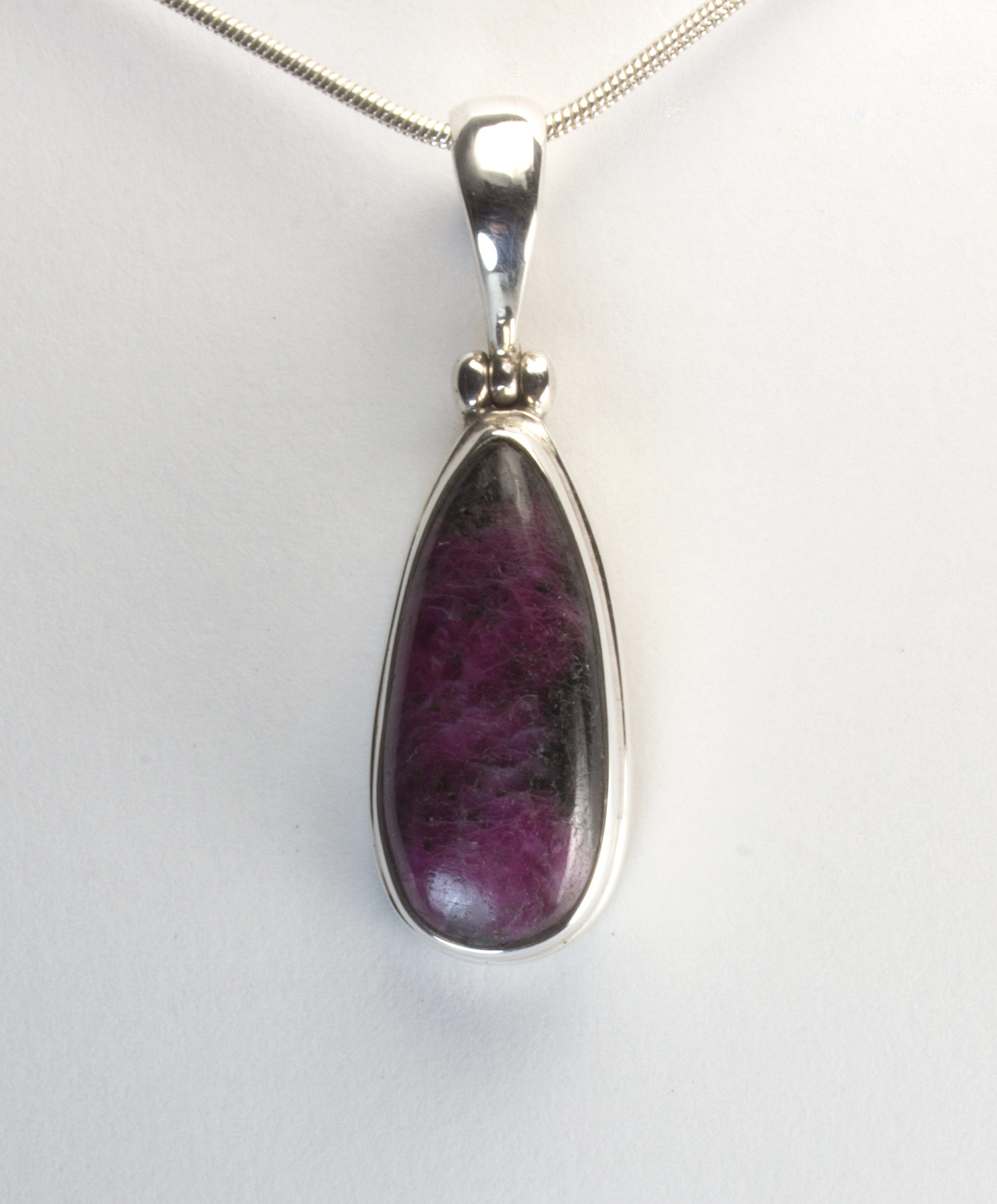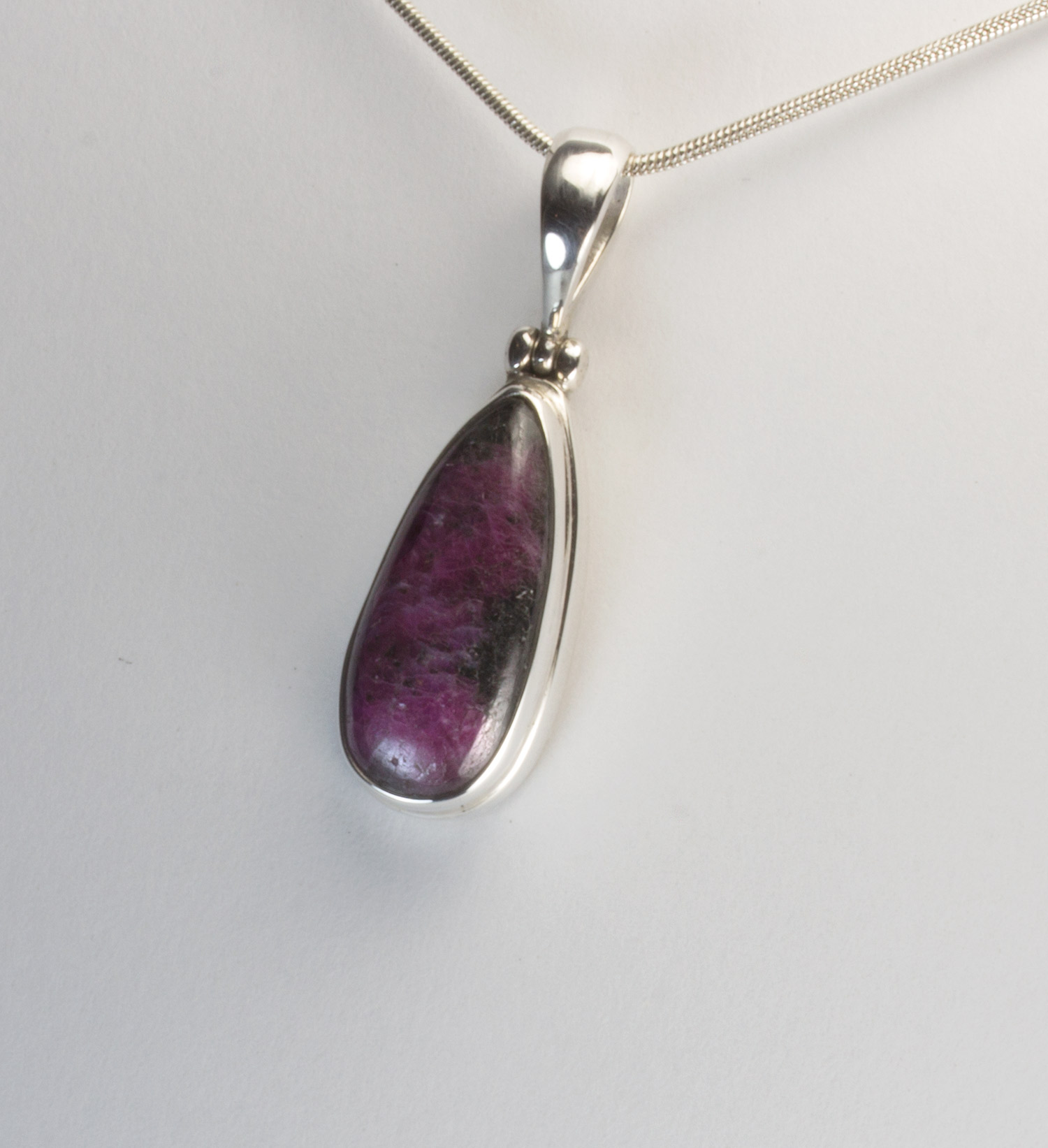 Colgante lagrima de rubi-zoisita y plata de ley 925. El rubí-zoisita es una piedra semipreciosa especial donde se encuentran unidos la piedra rubí, de color rosado oscuro o magenta, con la zoisita, de color verde, conformando un precioso tapiz de tonos verdes y rosas. En algunas piezas resaltan uno u otro componente, en este caso es el rubí el que se extiende por toda la piedra. La forma es de lágrima alargada y mide 2,3 por 1 cm. El largo total del colgante con la anilla es de 3,9 cm. Está elaborado en modo artesanal.