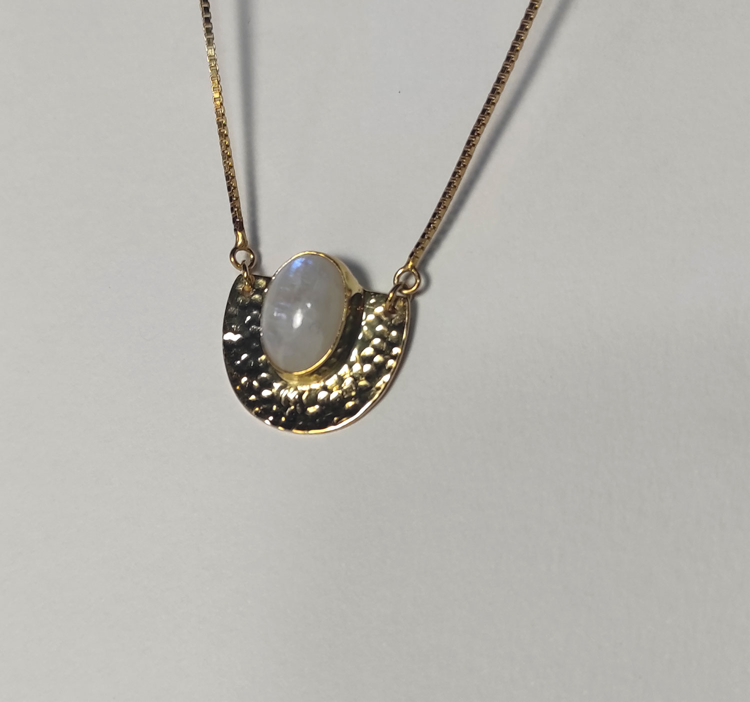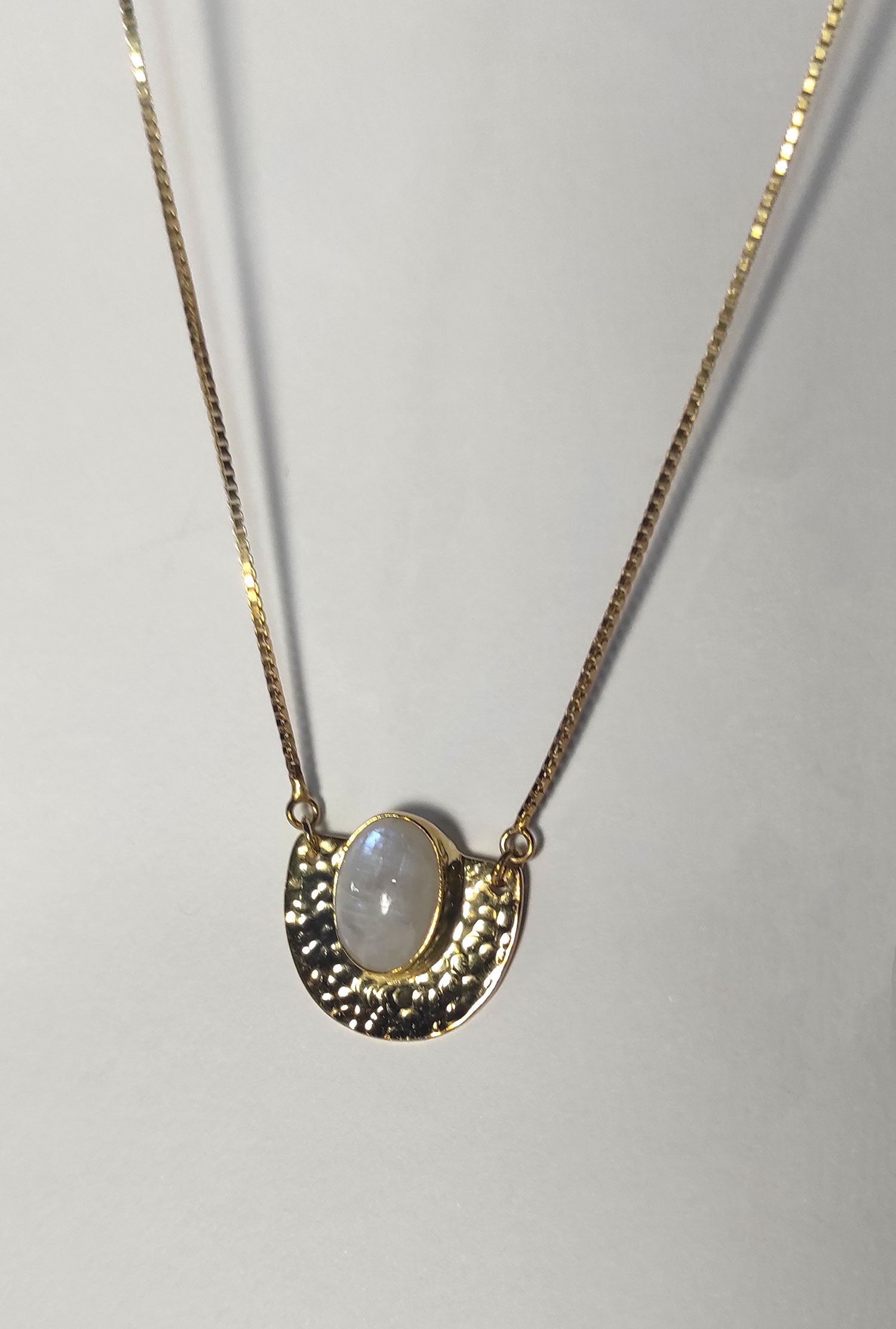 Colgante media luna en oro con una piedra de luna arco iris engarzada. La piedra es de forma ovalada y mide 13×9,5mm. La media luna, con textura martelada, tiene 21mm de anchura. Está elaborado en plata de ley 925 y llevan un baño de oro de 18 quilates. La cadena mide 45cm. y puede añadirse un extensor si se desea más larga.