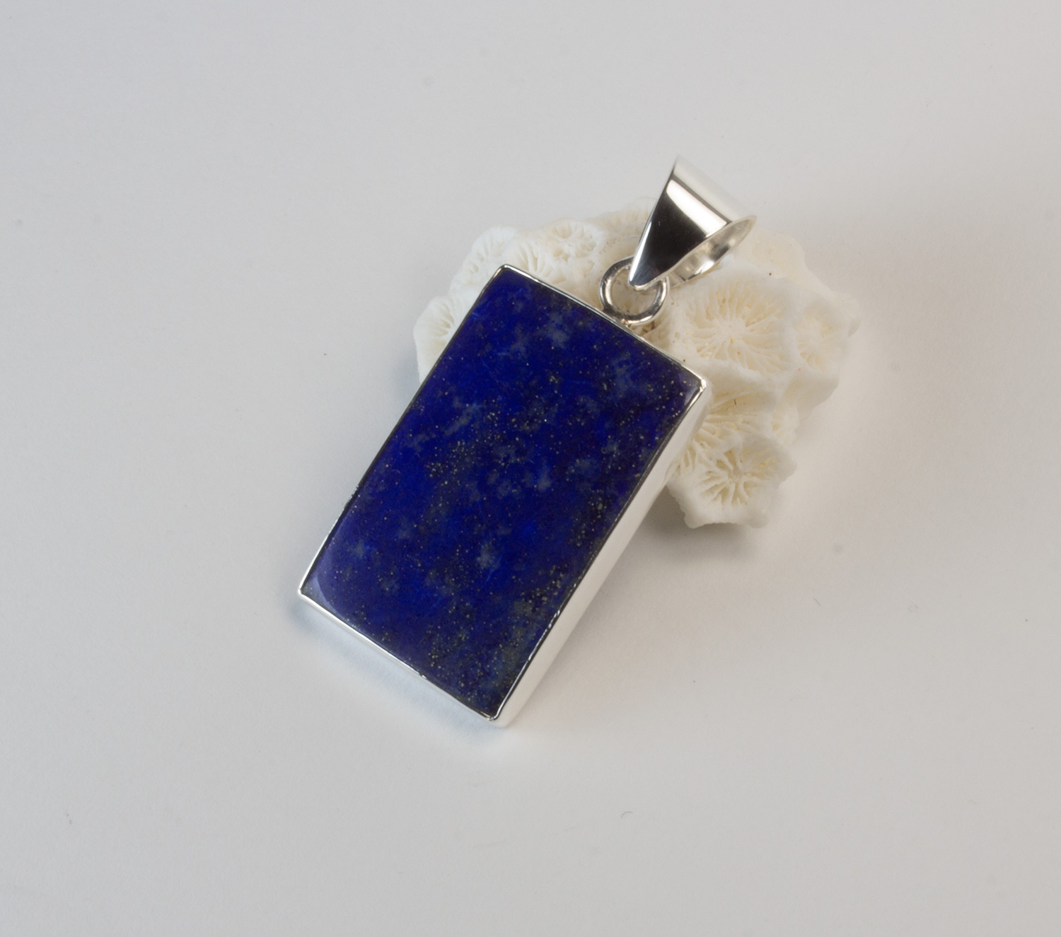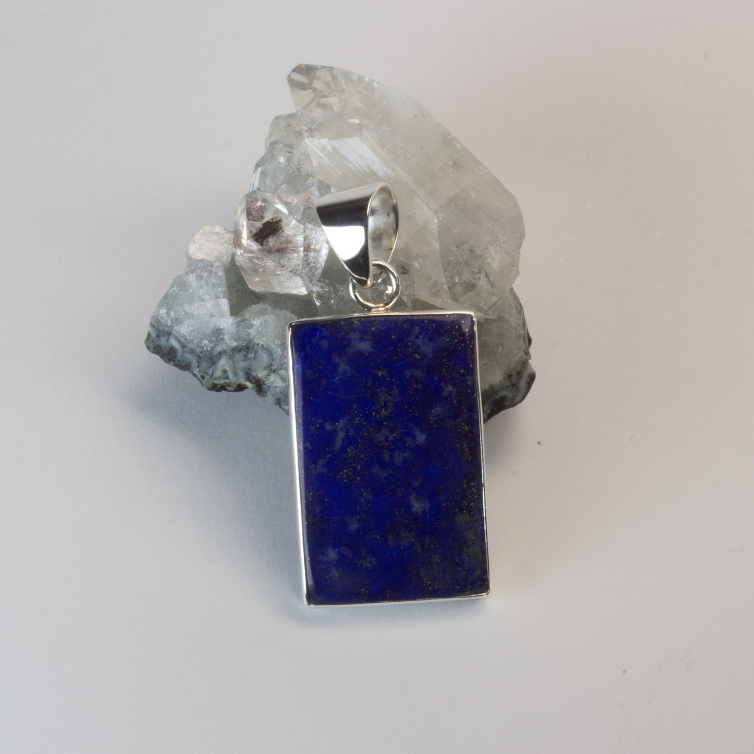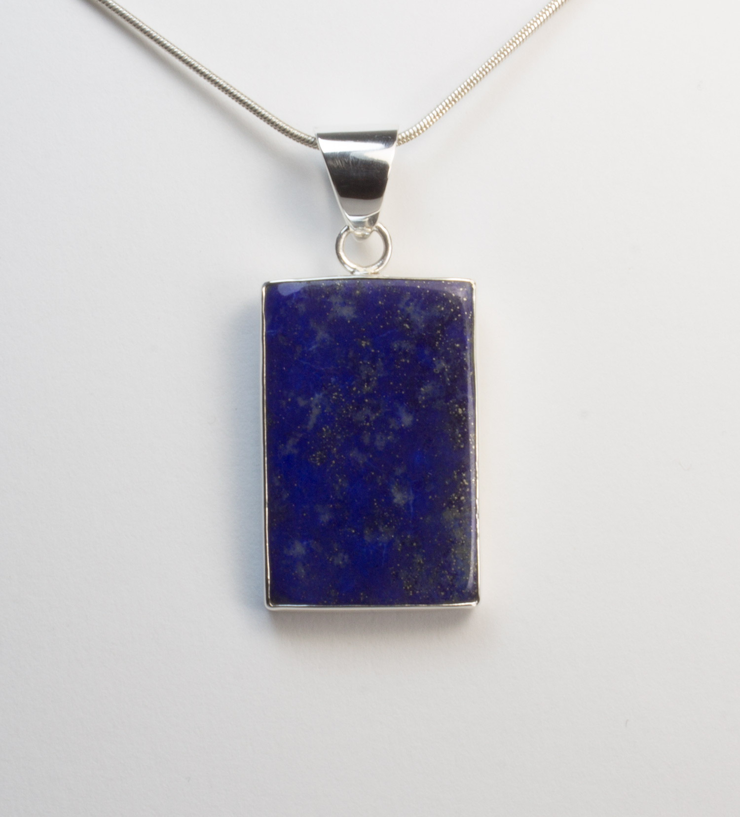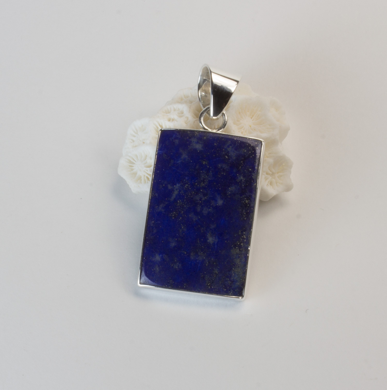 Colgante rectangular de lapislazuli y plata de ley 925. Es un lapislázuli que proviene de Afganistán, donde están los mejores yacimientos. De color azul noche profundo, está puntillado con las características motas de pirita del lapislázuli de alta calidad. Su forma es rectangular y mide 3,1 cm de largo por 2 de ancho. Va engarzado de una forma sencilla dejando el predominio del diseño a la piedra. El largo total del colgante con la anilla es de 4,5 cm. Está trabajado artesanalmente.