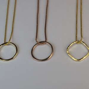 Colgantes geométricos en oro y plata de ley 925. Está elaborado en plata de 1ª ley (925) y con baño en oro rosa y oro de 18 quilates. Las cadenas son de plata de ley también y con baños de oro como los colgantes. Los colgantes circulares de oro 18K miden de diámetro 15mm y 19mm. El colgante circular de oro rosa mide 15mm y el colgante de oro amarillo con forma de rombo 14mm de lado. El colgante de plata 19mm. La cadena de oro rosa mide 45cm y las de plata y oro 18K 42cm. Los colgantes están elaborados en forma artesanal.