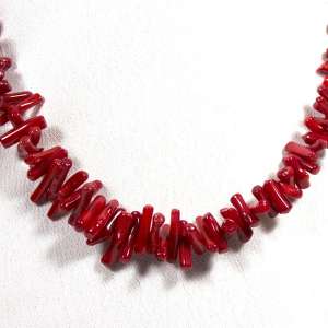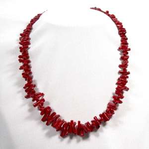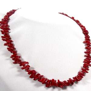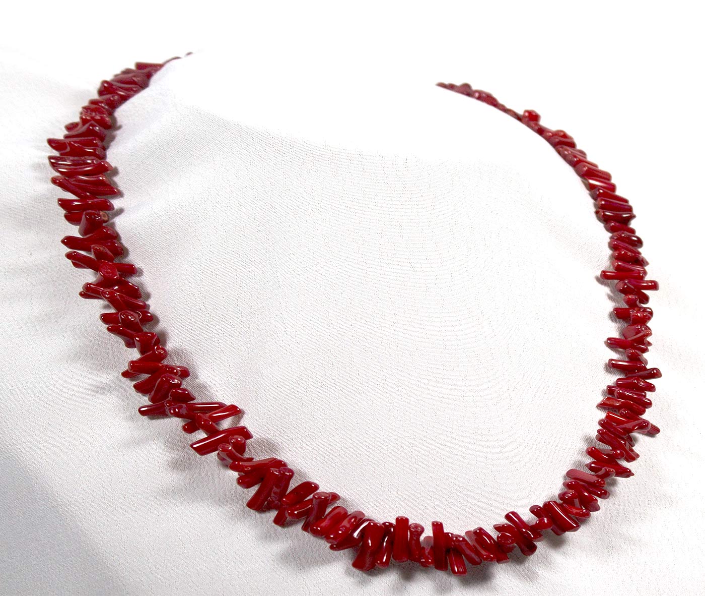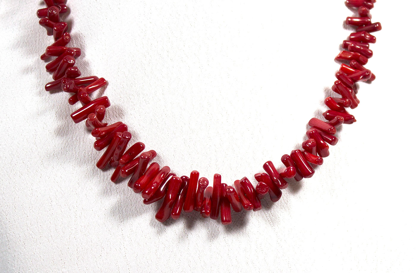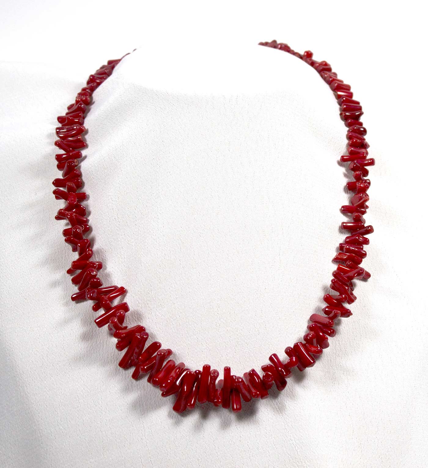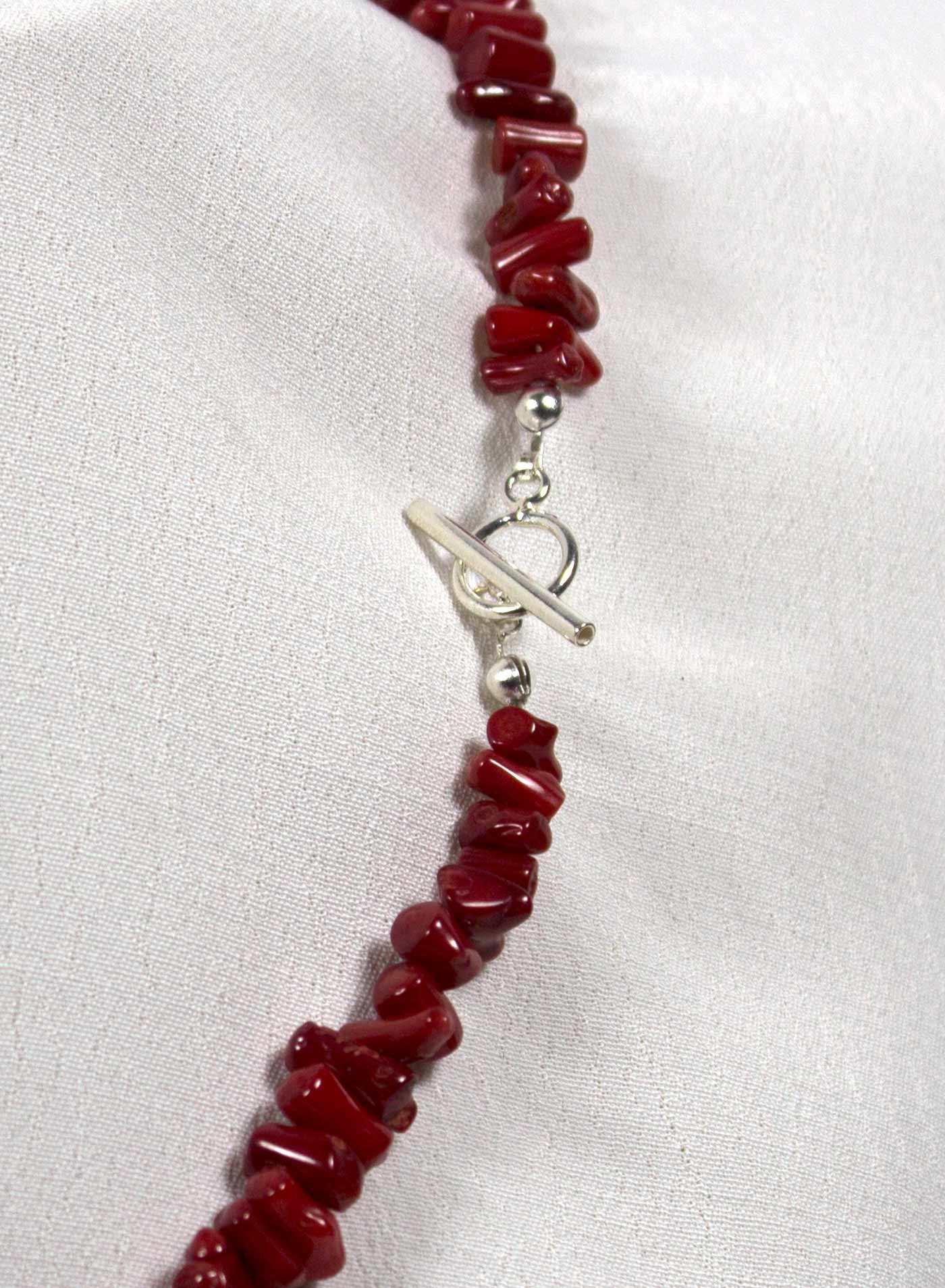 Collar de coral rojo y cierre de plata de ley 925. Tiene un color rojo intenso y las piezas van engarzadas decreciendo en tamaño. El largo del collar es de 46 cm. El cierre es de palanca y es de plata de ley. Está elaborado en modo artesanal.