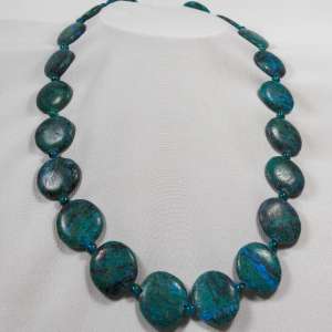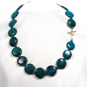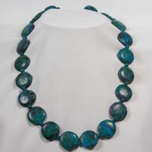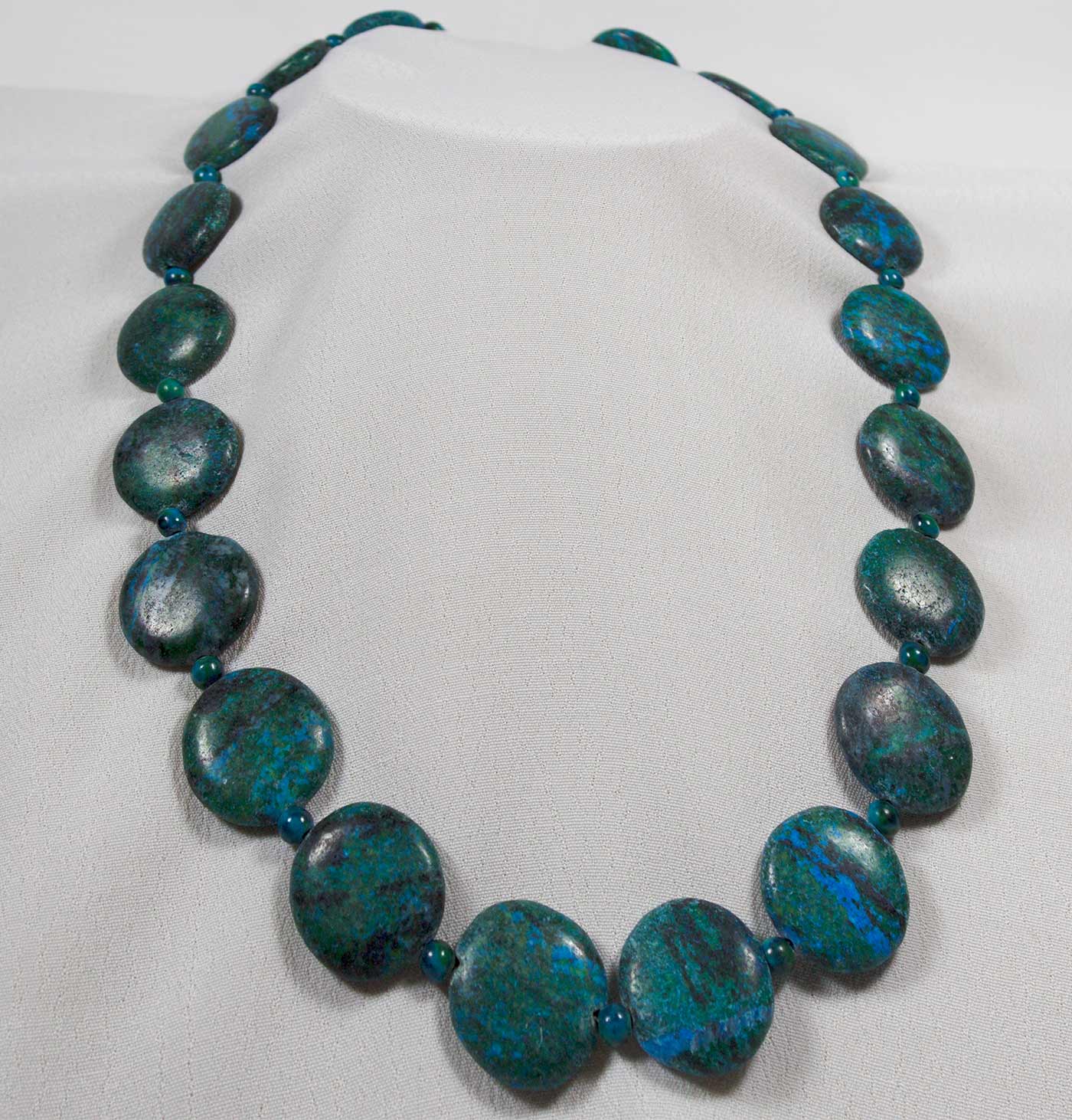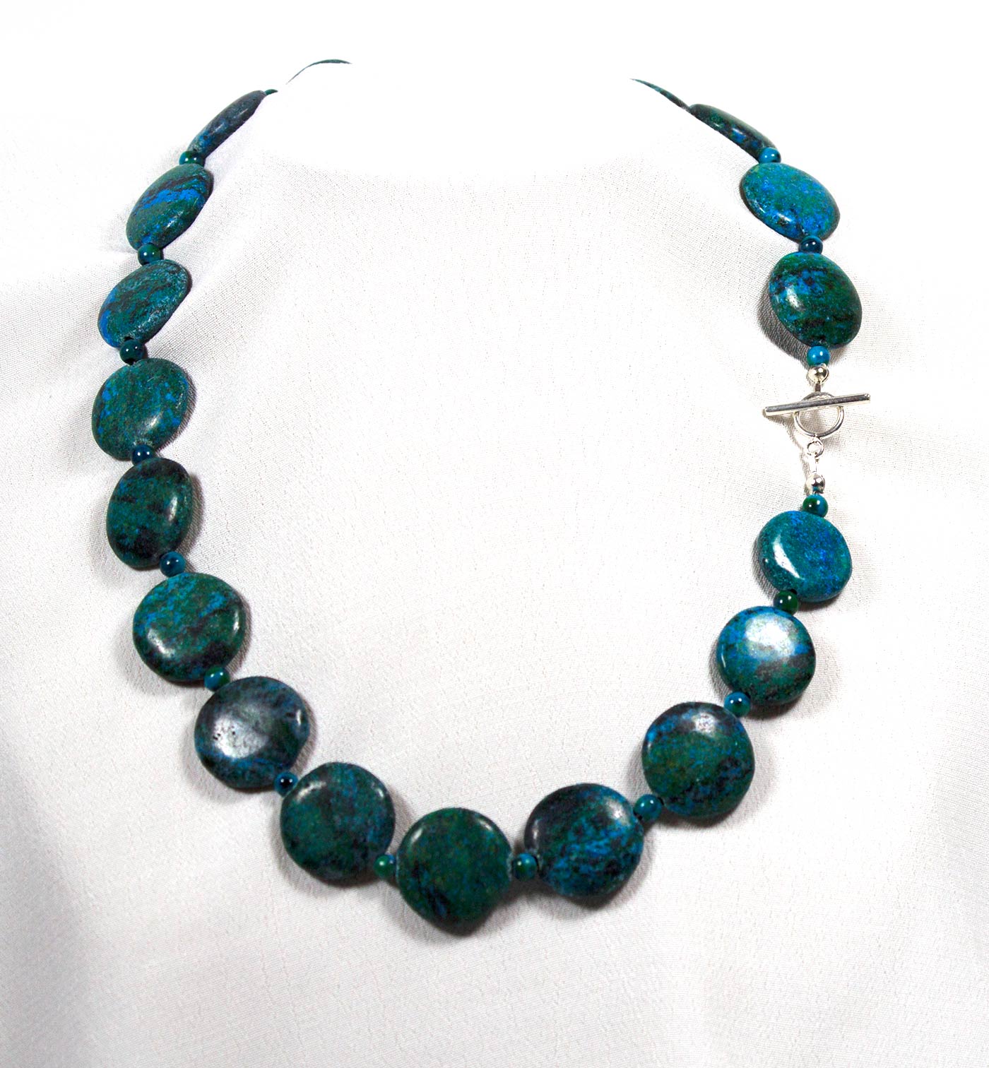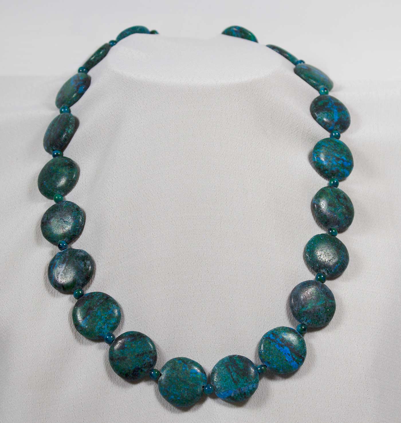 Collar de crisocola y cierre de plata de ley 925. Es de cuentas redondas de 2 cm de diámetro separadas por pequeñas cuentas redondas. La crisocola es de colores azules, verdes, amarillos y marrones. El cierre es de palanca en plata de ley 925. El largo del collar es de 48 cm y su peso de 76 gr. La crisocola se caracteriza por su vistosidad. Puede presentar tonalidades azules y verdes, debido a su alto contenido de cobre. Hay ocasiones en las que se encuentra cubierta por una fina capa de cuarzo e incluso entrelazada con éste. Espiritualmente ayuda a enfriar las emociones ardientes y excitantes tan pronto como toca la piel. Alivia el estrés relacionado con el trabajo; la piedra Crisocola nos recuerda que debemos salir de la vida cotidiana y tomarnos un tiempo para flotar por el río turquesa del espíritu interior. Se conecta con el agua, y ayuda fuertemente a la rutina diaria de bienestar. Collar elaborado de forma artesanal.