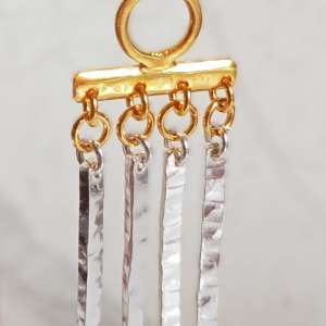 Modelo etrusco en plata de ley 925 y en oro chapado de 18K. Recuerda por sus formas el mundo antiguo. Originales por su diseño y la combinación de plata y oro. Largo 6cm, ancho 1,5cm. Es un trabajo artesanal.