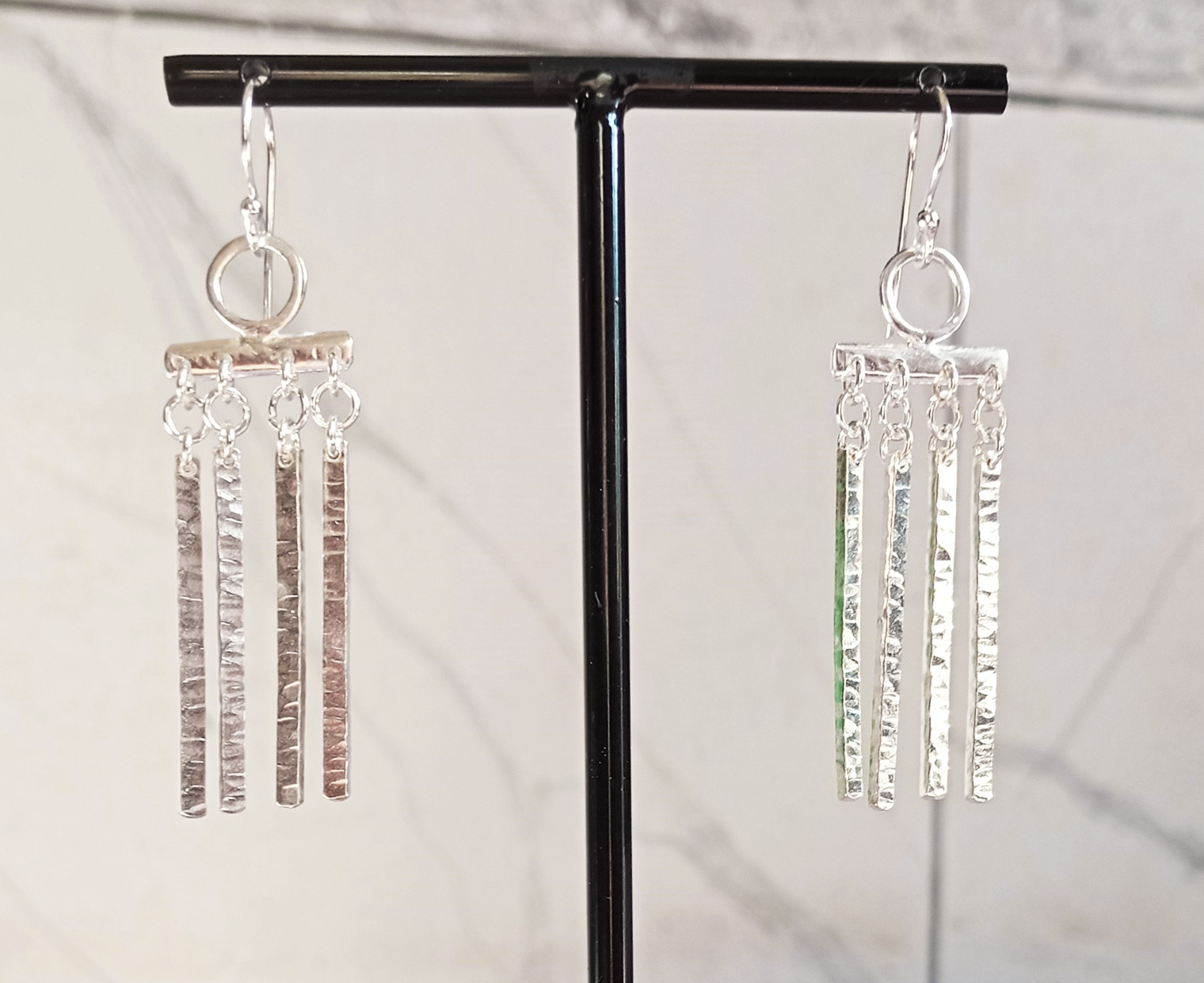 Modelo etrusco en plata de ley 925. Estos pendientes recuerdan por sus formas el mundo antiguo. Originales por su diseño, el martelado y la combinación de elementos geométricos. Largo 6cm, ancho 1,5cm. Es un trabajo artesanal.