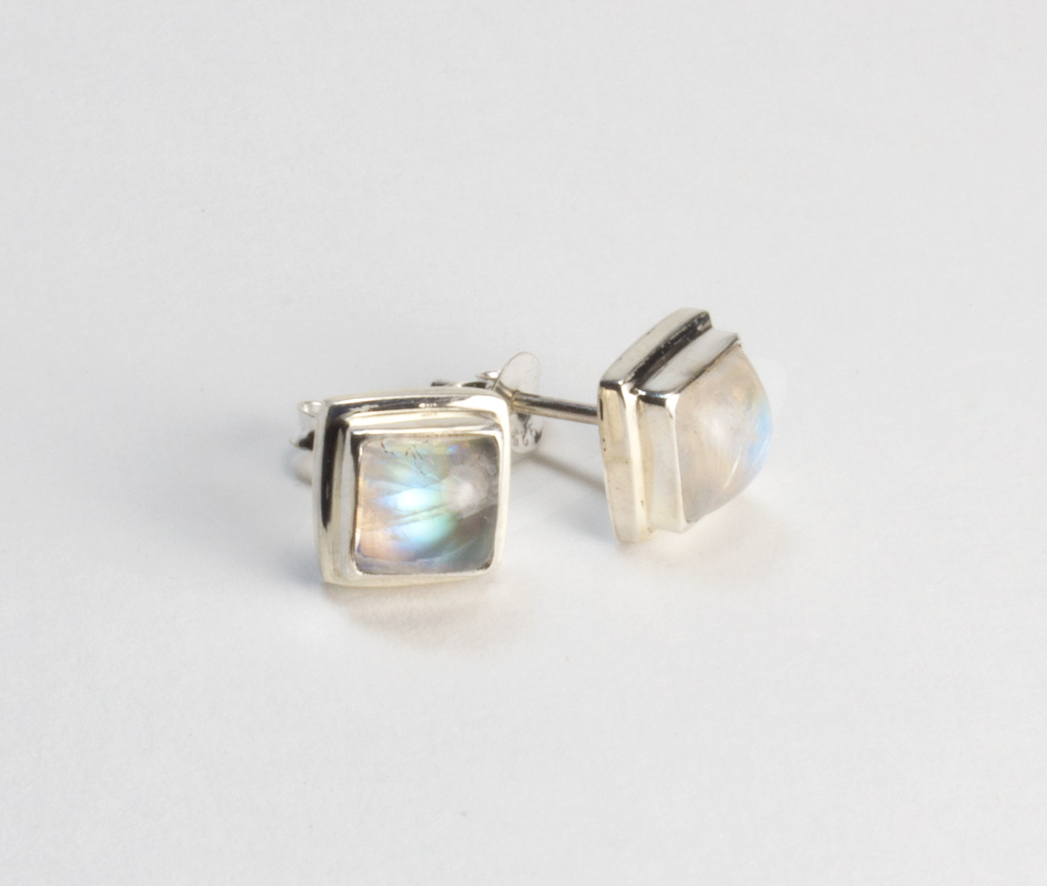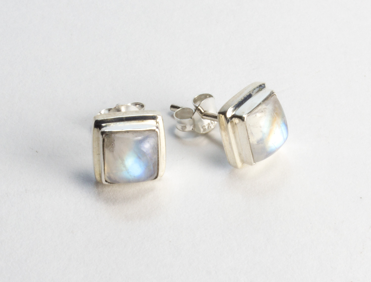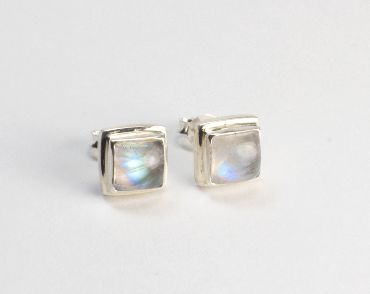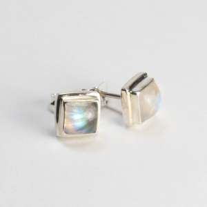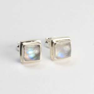 Pendientes a presion con piedras de luna y plata de ley 925 . Estos pendientes vienen engarzados con piedras de luna arco iris de gran iridiscencia. Se llaman piedras de luna arco iris por su reflejo, ya que a la incidencia de la luz emiten el espectro del arco iris. Estos pendientes son de forma cuadrada y las piedras vienen talladas en cabujón para que el efecto iridiscente llegue al máximo. El pendiente tiene un tamaño de 0,9 mm de lado, las piedras 0,6 mm y la altura 0,5 mm. El cierre es a presión. Está elaborado en modo artesanal.