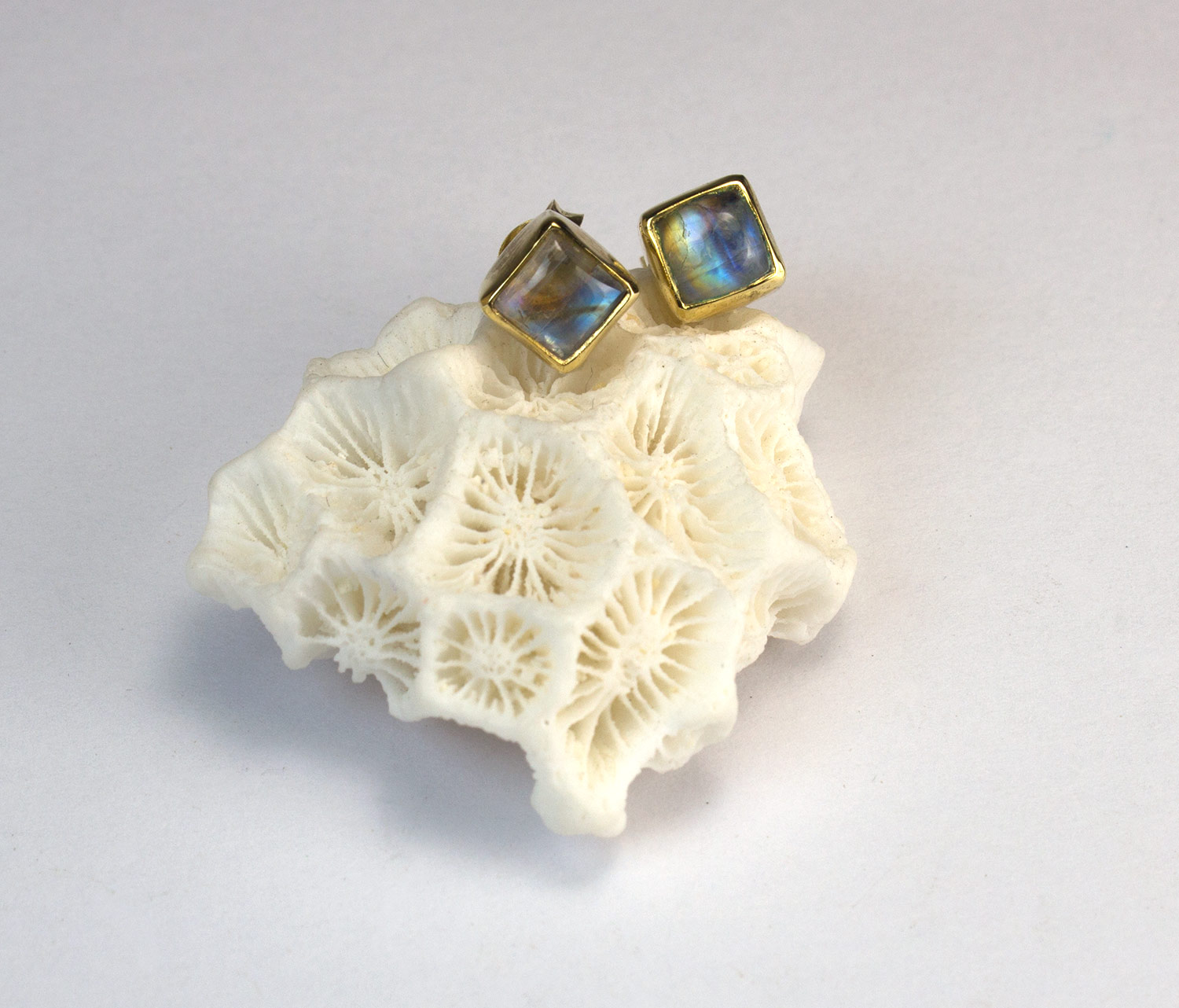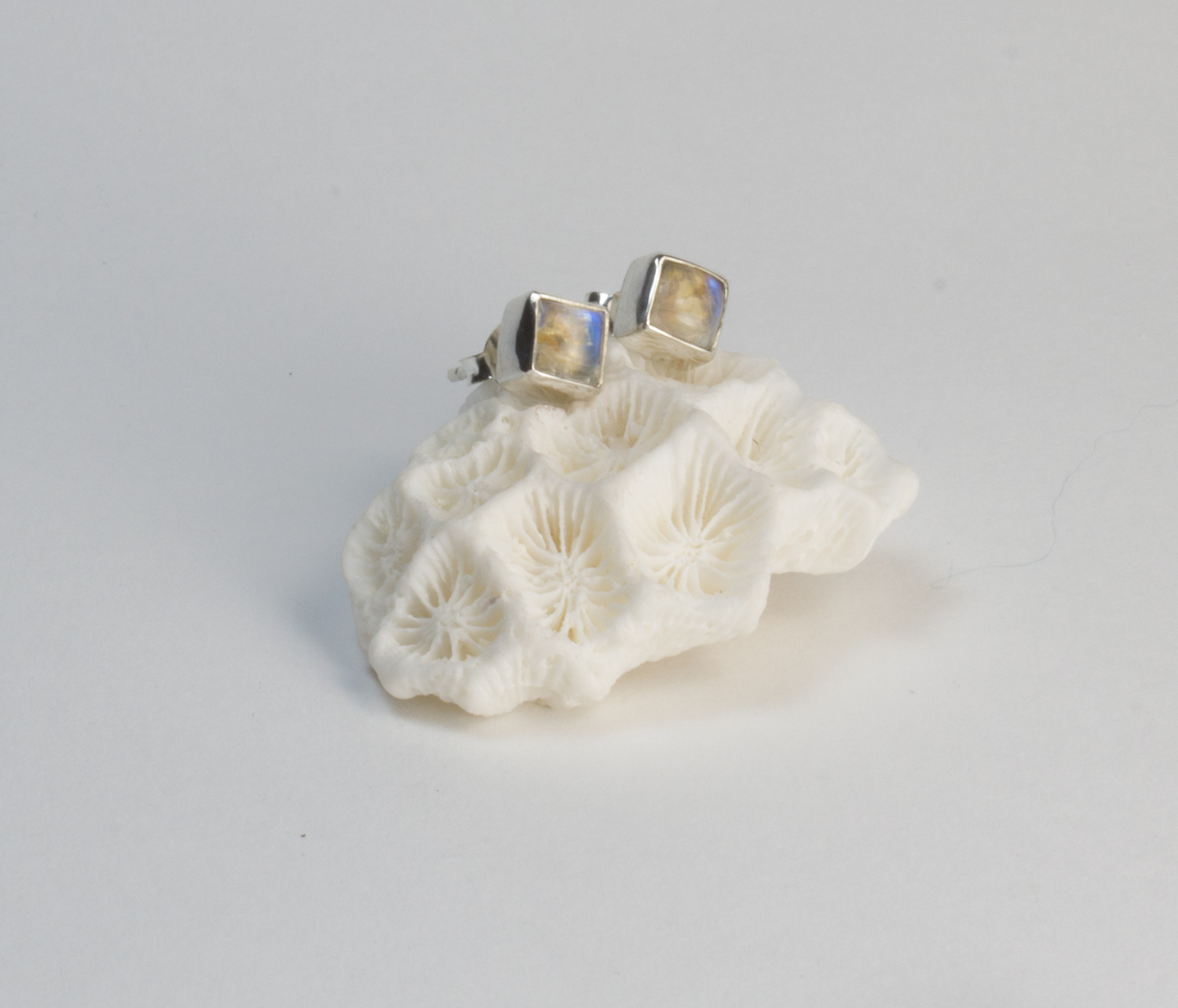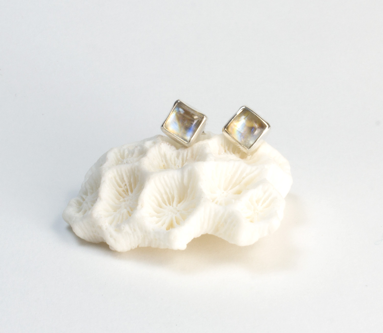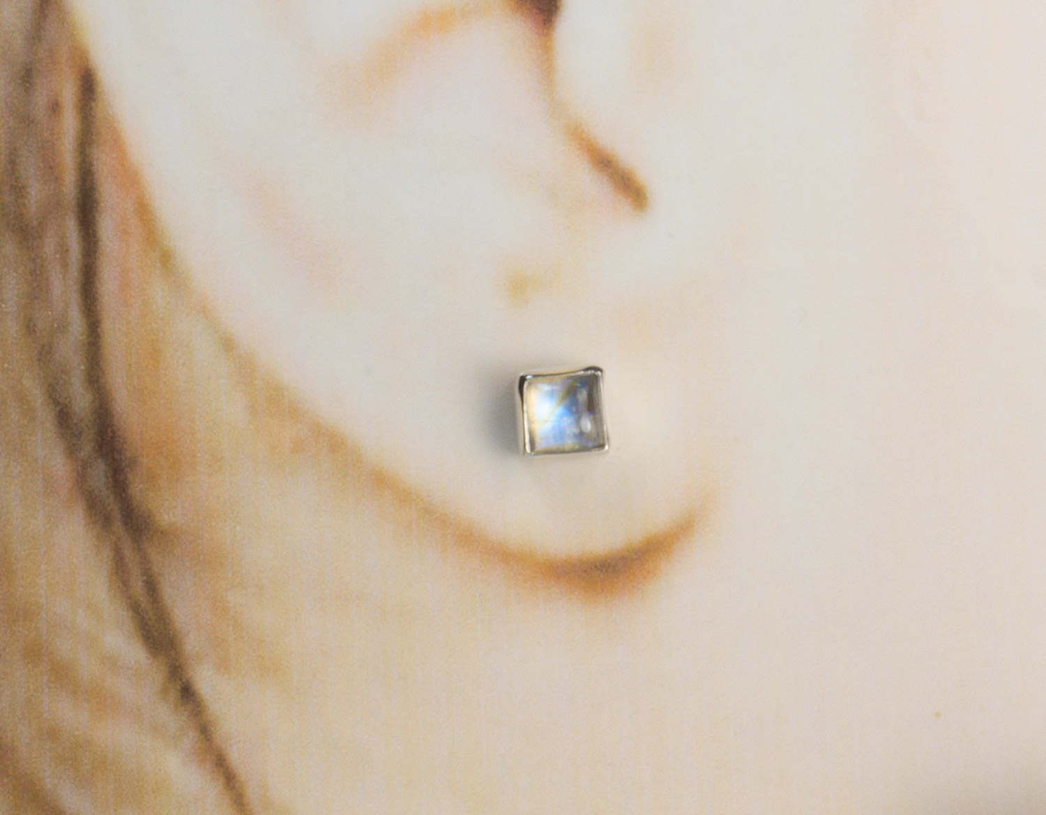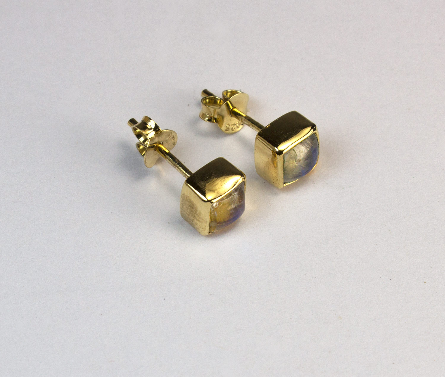 Pendientes a presion de piedra de luna, plata de ley 925 y también plata 1ª ley con baño en oro 18 quilates . Estos pendientes vienen con una piedras de luna arco iris de gran iridiscencia talladas en cabujón. Son de forma cuadrada y tienen un tamaño de 0,6 mm de lado, y con altura de 0,5 mm. El cierre es a presión. Se han elaborado en modo artesanal.