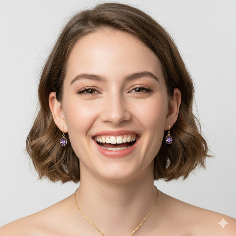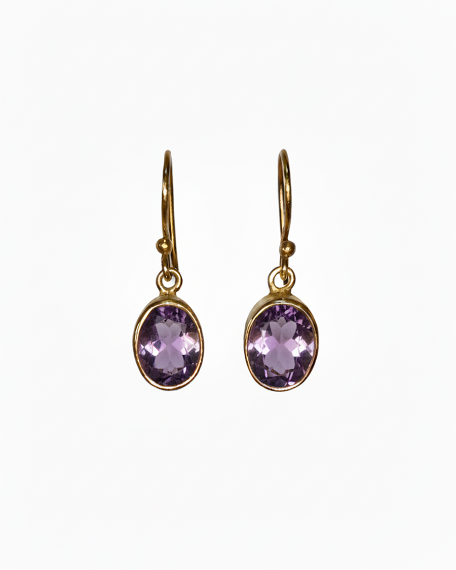 Pendientes con amatistas facetadas. Elaborados en plata de ley 925 y chapados en oro 18 quilates. Las amatistas miden 9×8 mm. El largo del pendiente es 3,5 cm.