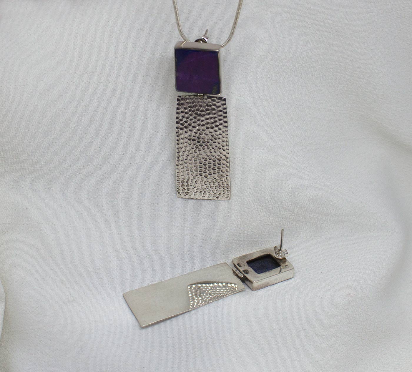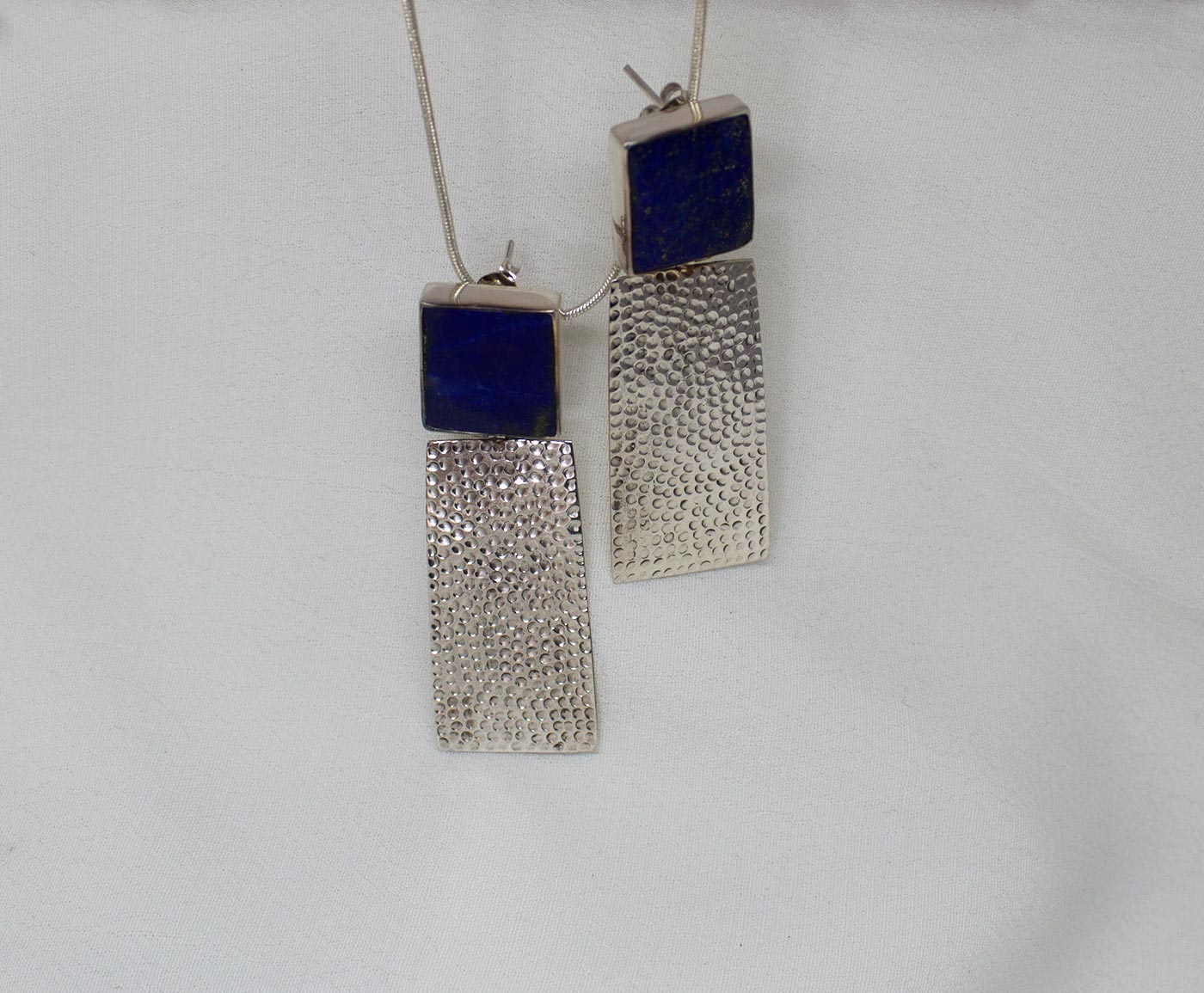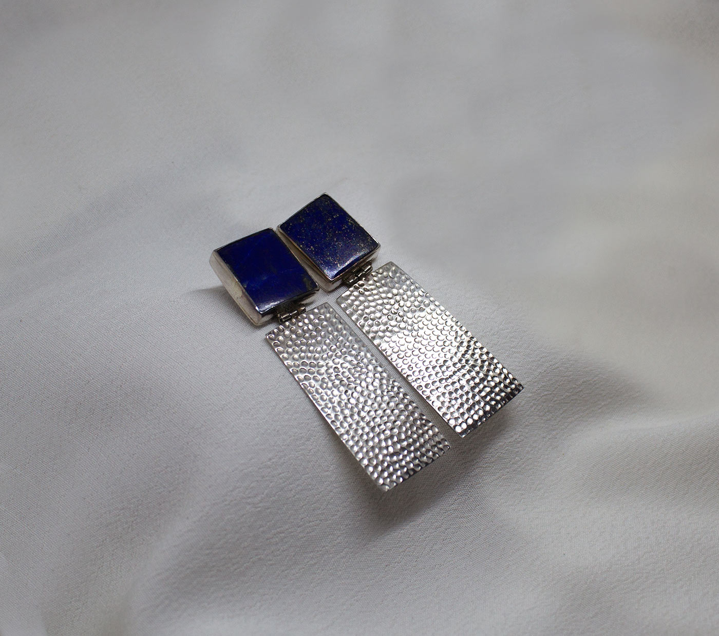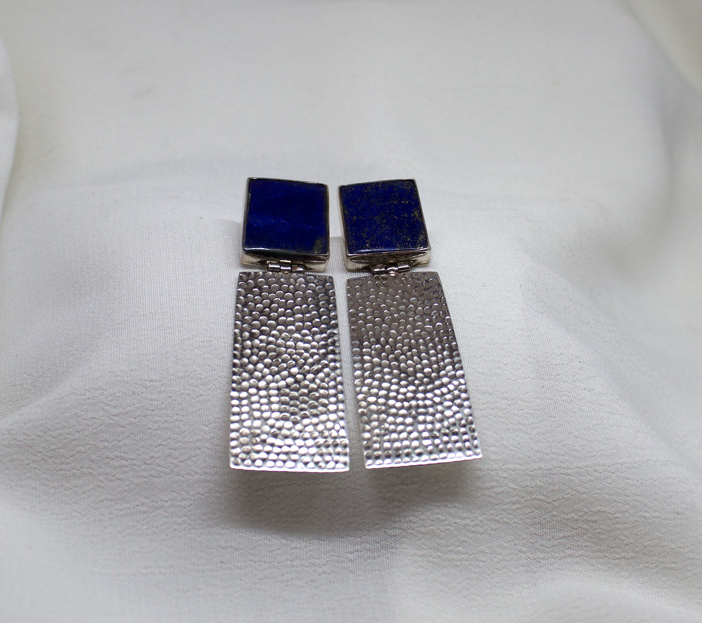 Pendientes con lapislazuli rectangular y plata de ley 925. El lapislázuli proviene de Afganistán, donde se encuentran las minas con las vetas de mejor calidad; es de color azul noche profundo con motas de pirita que atestiguan su autenticidad. Constan de dos partes con una bisagra que los une: la parte superior es ligeramente rectangular y lleva en ella el lapislázuli engarzado. Tiene un cierre a presión de mariposa. La parte inferior es trapezoidal, alargada y con una textura de martelado fino que realza el diseño. Son unos pendientes muy elegantes, festivos y originales. El lapislázuli mide 1,8 cm por 1,5. El largo total del pendiente es de 5,7 cm. Están elaborados artesanalmente.