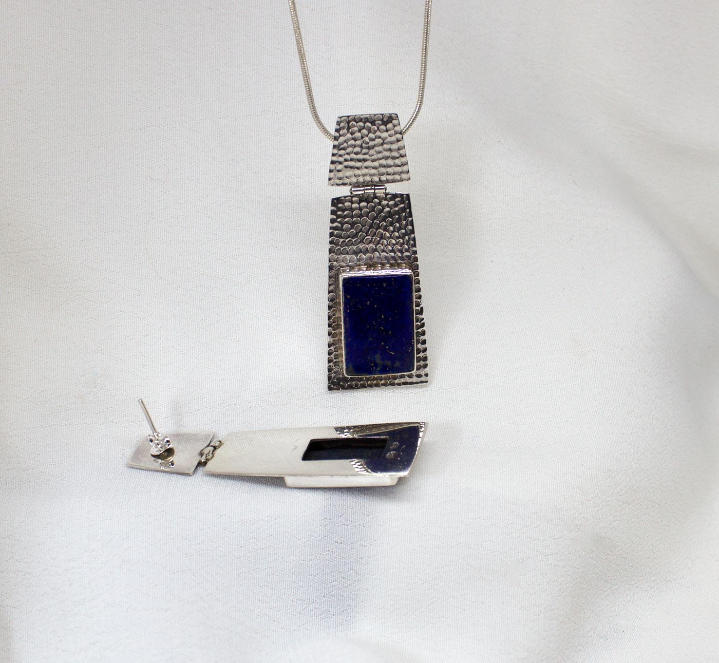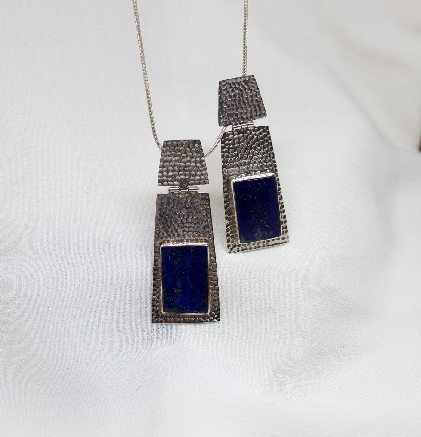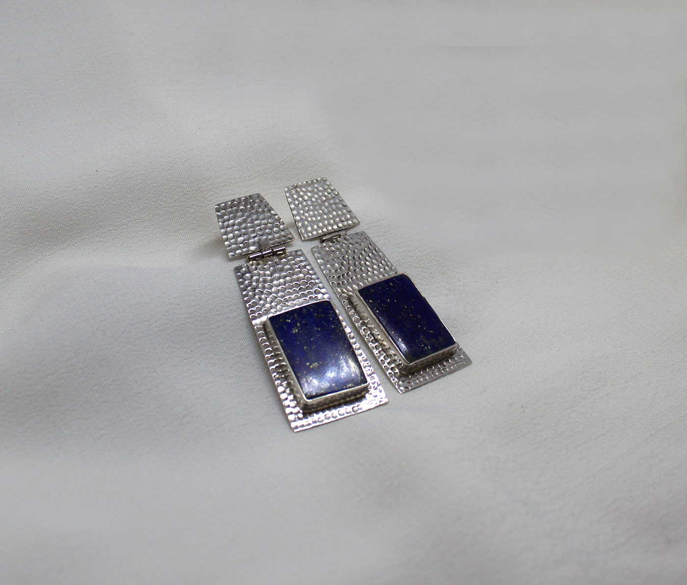 Pendientes con lapislazuli rectangular y plata de ley 925. El lapislázuli proviene de Afganistán, donde se encuentran las minas con las vetas de mejor calidad; es de color azul noche profundo con motas de pirita que atestiguan su autenticidad. Constan de dos partes con una bisagra que los une: la parte superior es trapezoidal y con un cierre a presión de mariposa. La parte inferior continua la línea trapezoidal y termina con un lapislázuli rectangular engarzado en la parte final. Los pendientes llevan una textura de martelado fino que realza tanto el diseño como la piedra. Son unos pendientes muy elegantes, festivos y muy originales. El lapislázuli mide 2 cm por 1,4. El largo total del pendiente es de 5 ,3cm. Están elaborados artesanalmente.