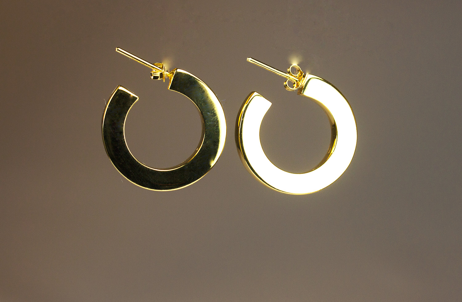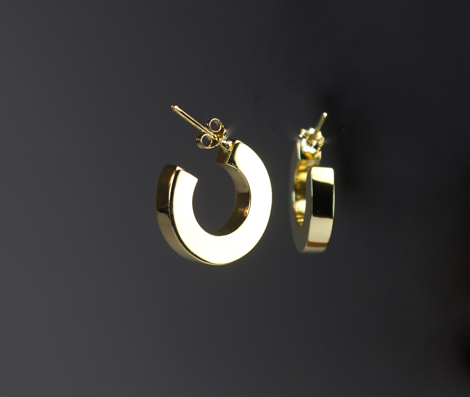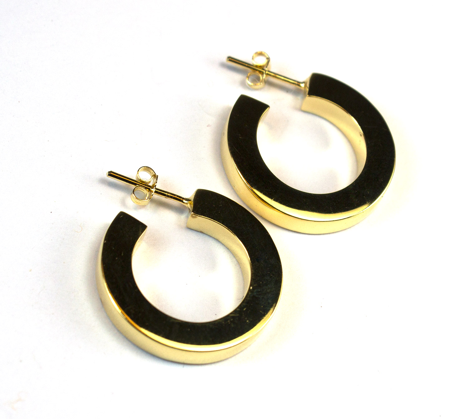Pendientes de aro con cierre a presión. El aro es de forma cuadrada con 3mm de anchura. El tamaño grande tiene 2,2 cm de diámetro, y el tamaño pequeño 1,8 cm.