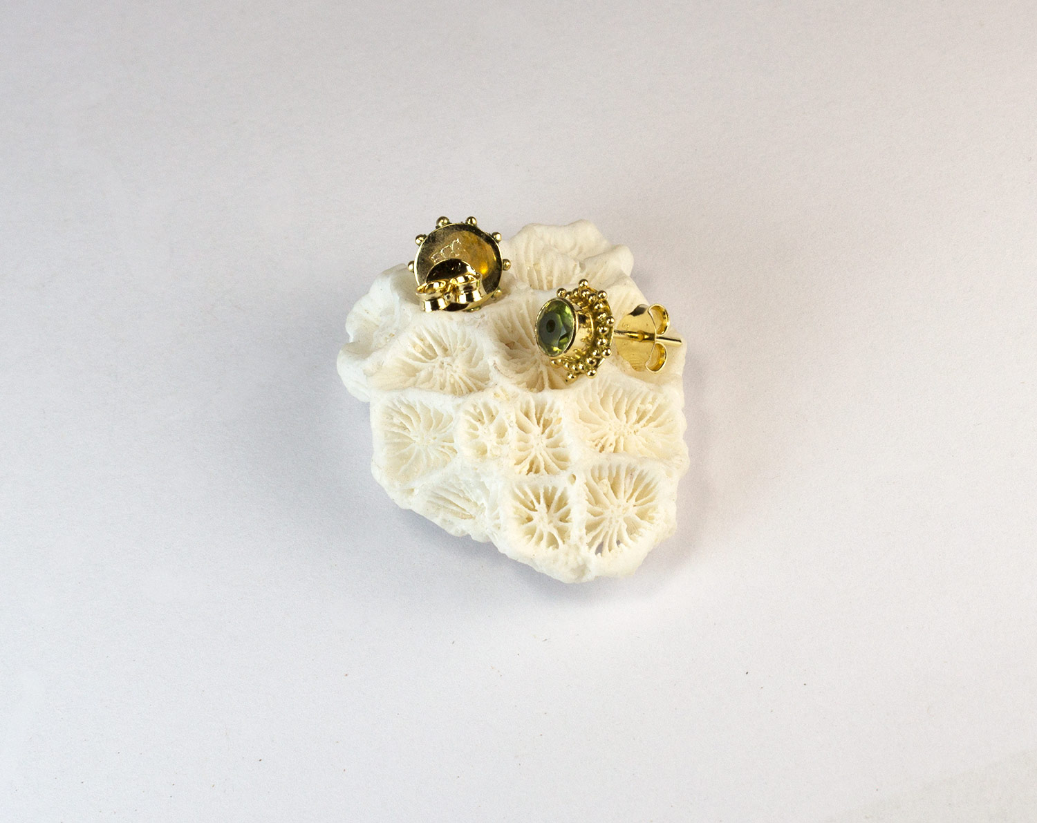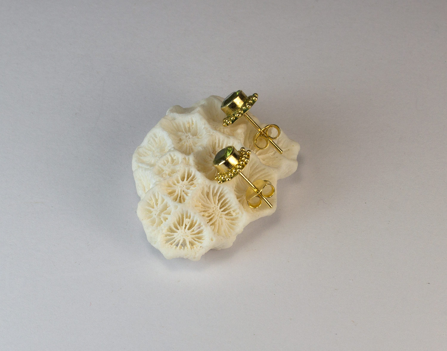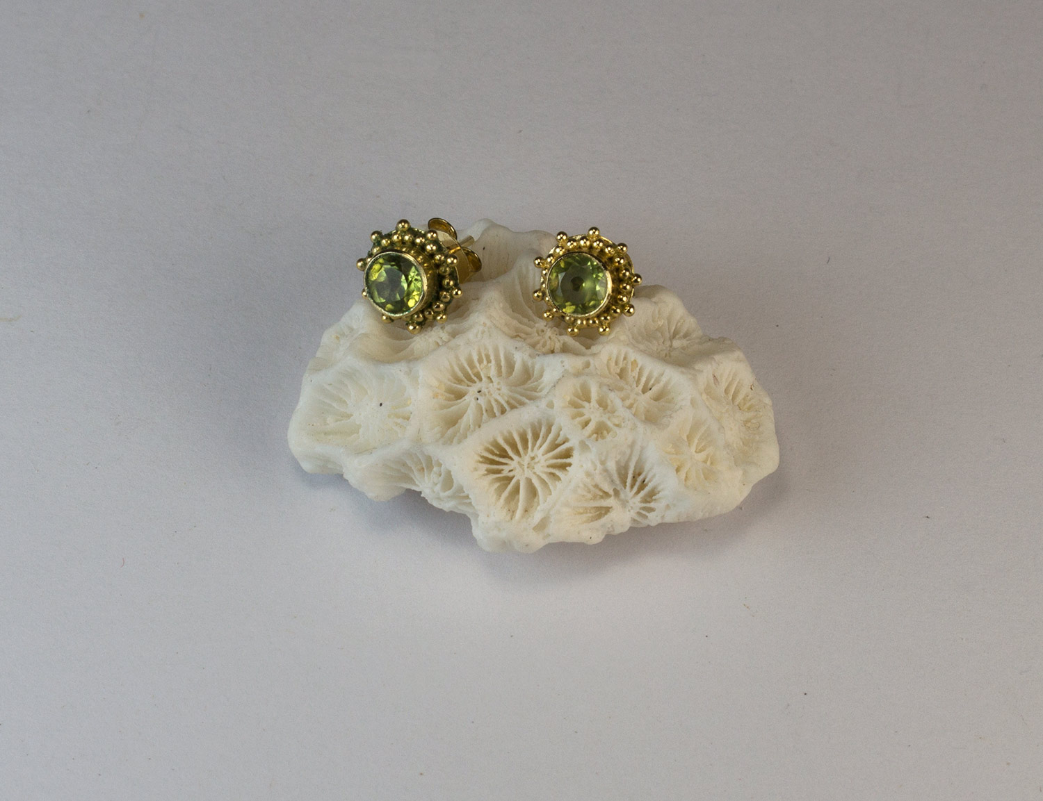 Pendientes de oro con un peridoto engarzado. Son de plata de ley 925 y llevan un baño en oro de 18 Kilates. . Tiene un trabajo muy delicado formando una estrella alrededor de la piedra. Esta viene facetada y es redonda, de 4mm de diámetro. Está elaborado artesanalmente.