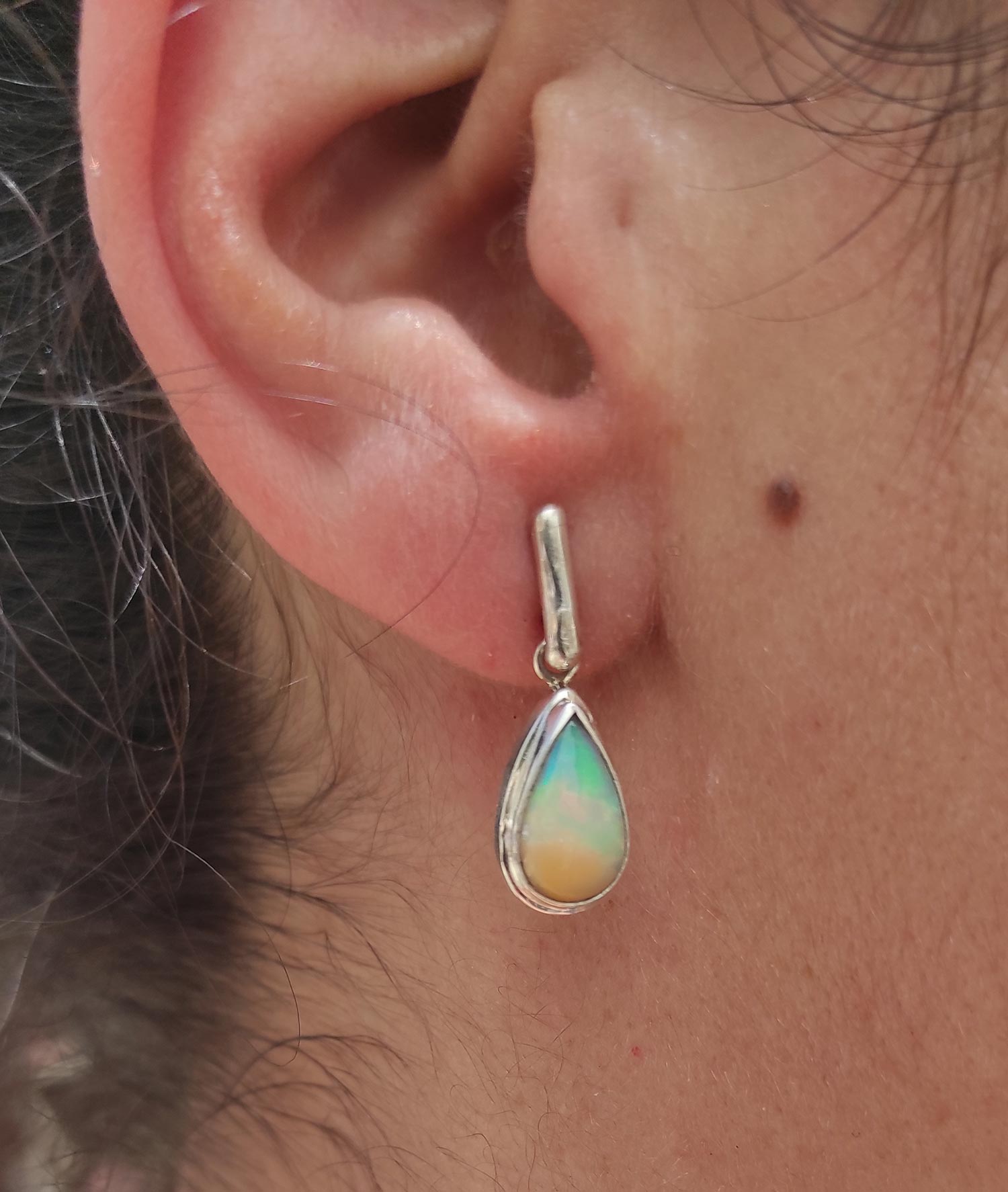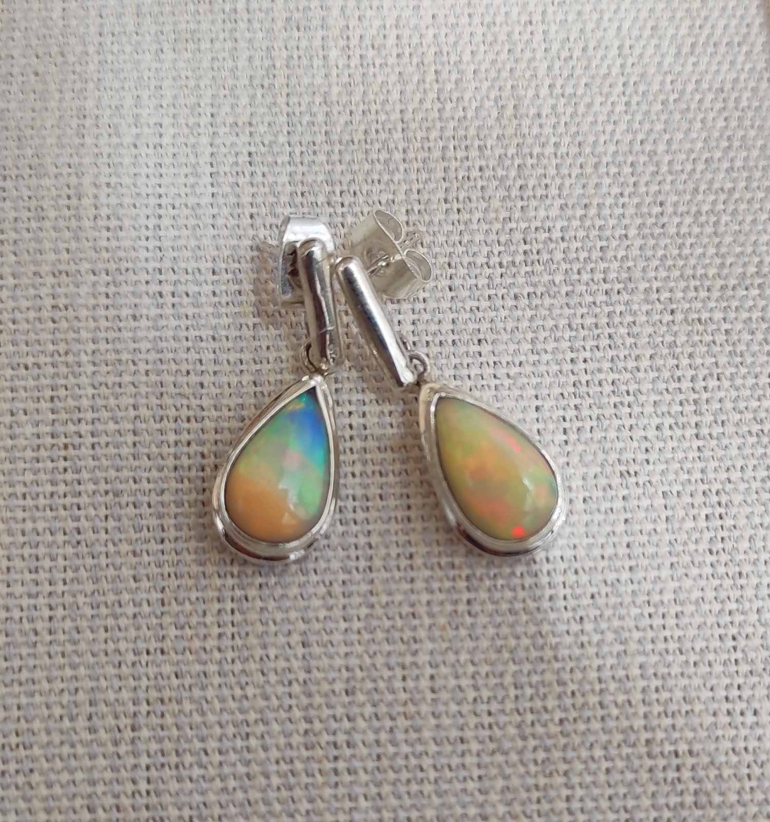 Pendientes de plata de ley con ópalos engarzados en forma de lágrima. Los ópalos proceden de Etiopía y tienen una gran opalescencia en colores rojizos, verdes, azules y dorados. Tienen un largo total de 26mm. Los ópalos miden 12x7mm. Se elaboran artesanalmente.