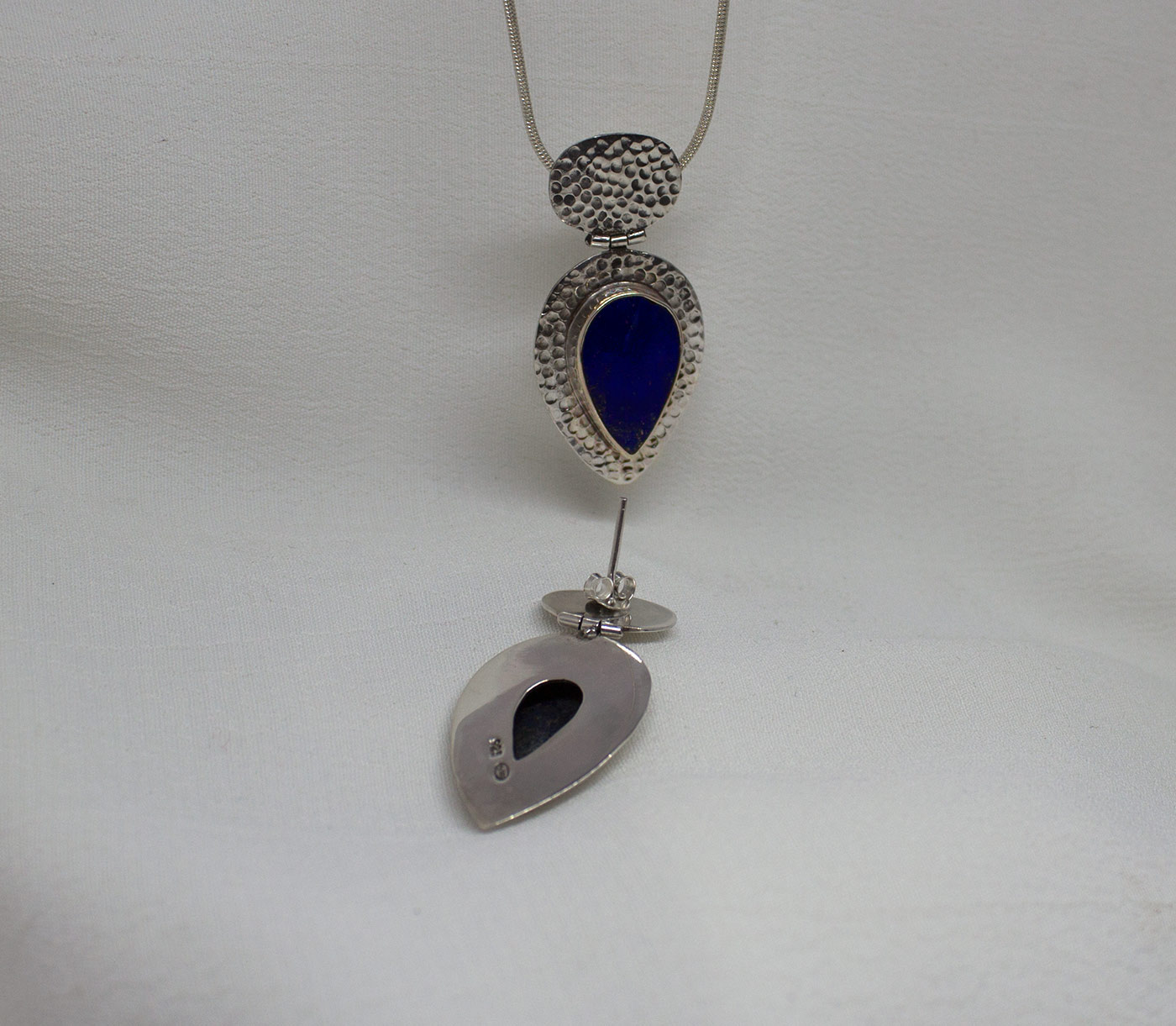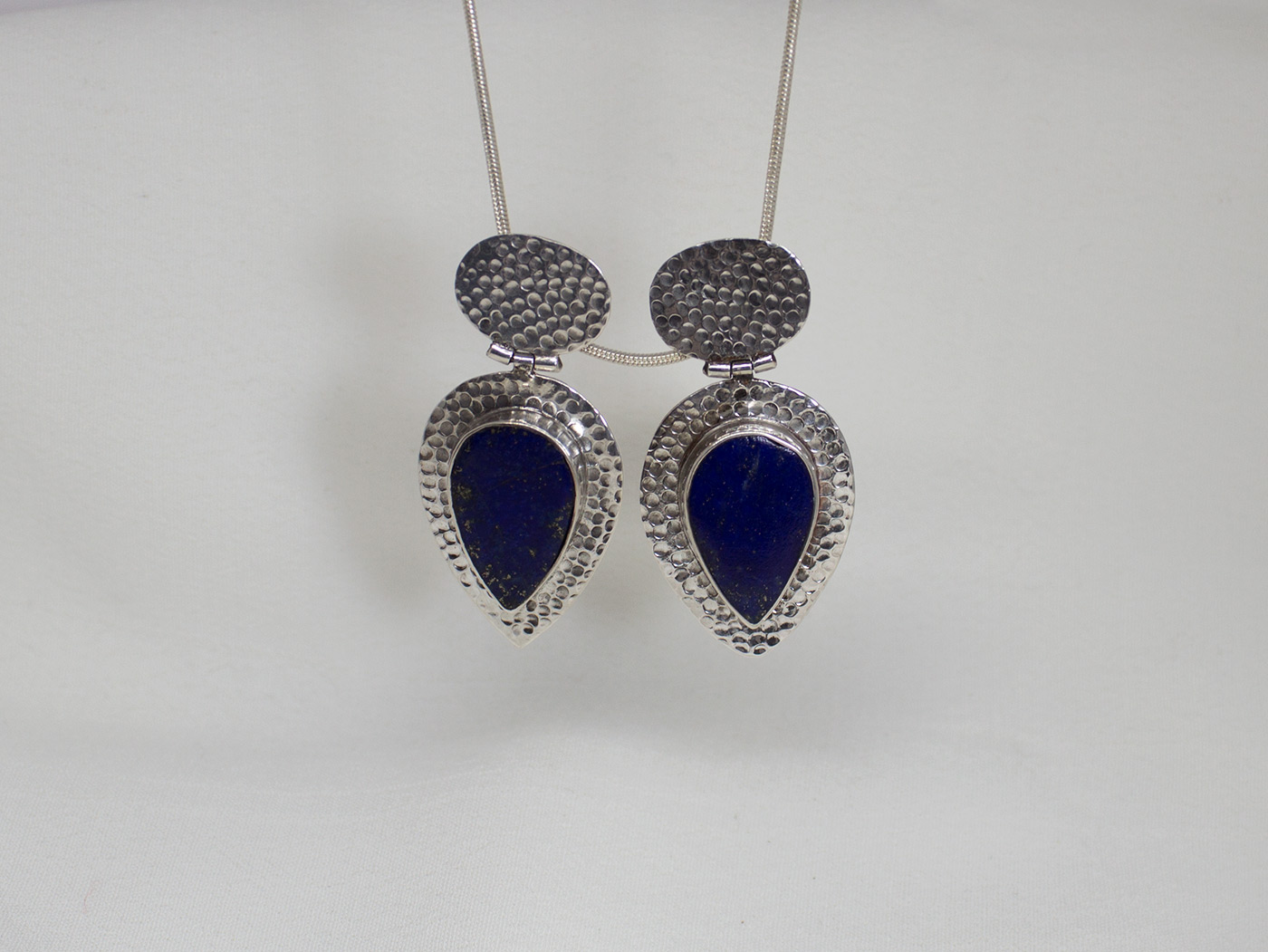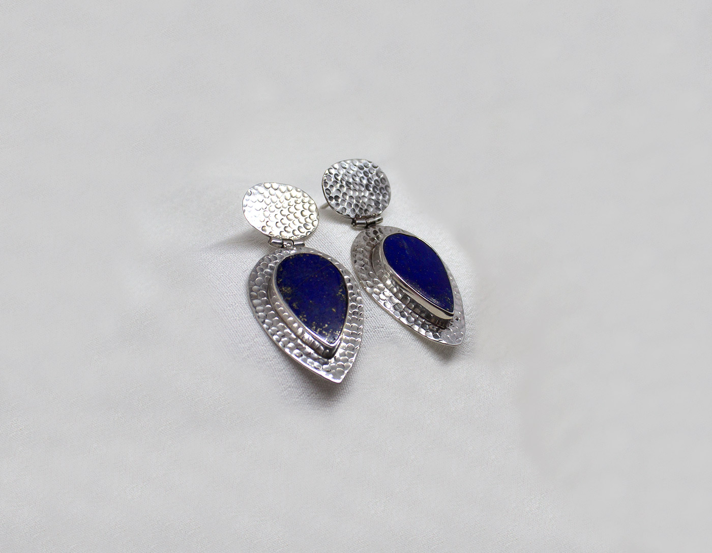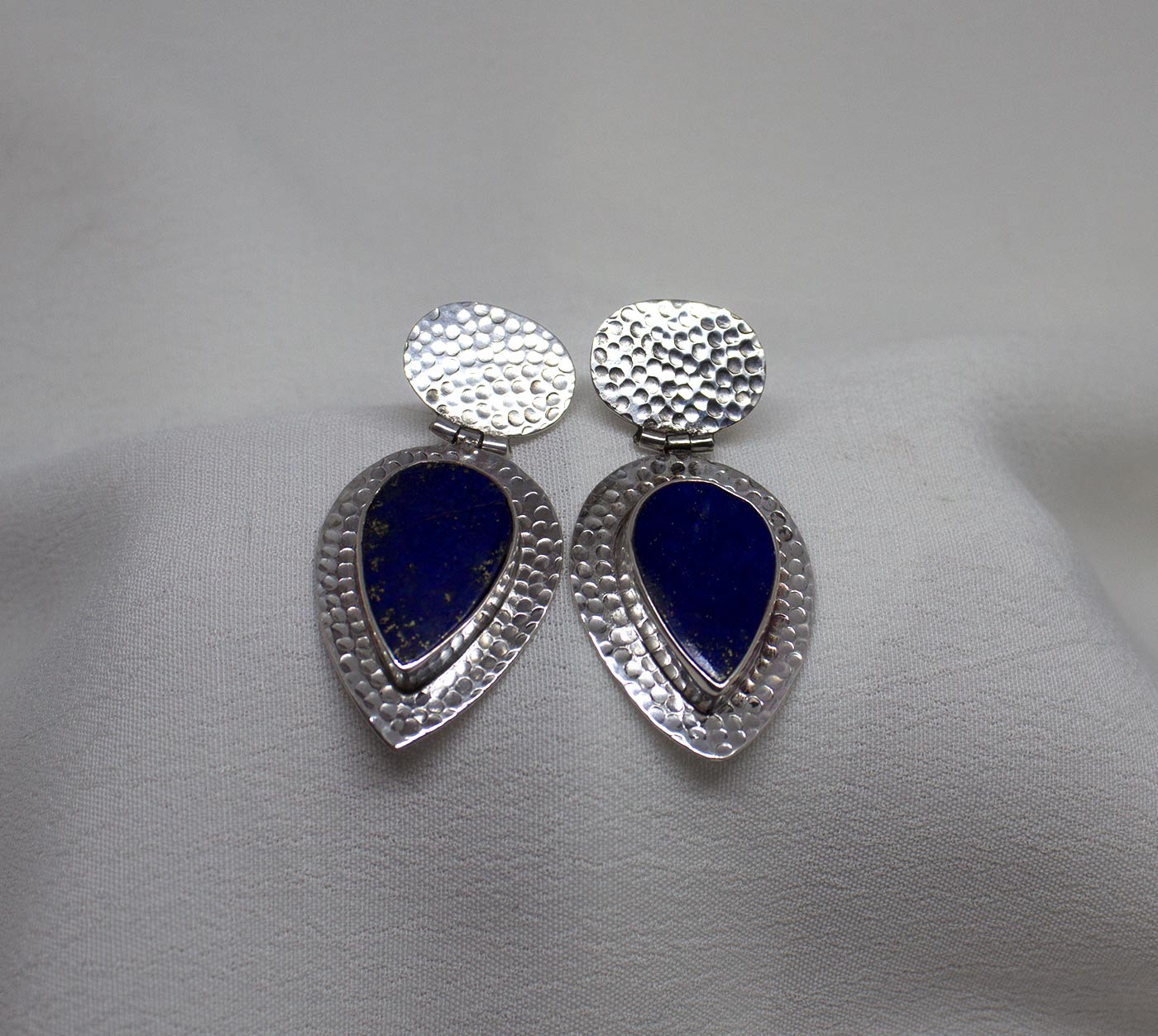 Pendientes lagrima con lapislazuli y plata de ley 925. El lapislázuli proviene de Afganistán, donde se encuentran las minas con las vetas de mejor calidad; es de color azul noche profundo con motas de pirita que atestiguan su autenticidad. Constan de dos partes con una bisagra que los une: la parte superior es ovalada y recoge la forma del lóbulo de la oreja y va unido a ella con un cierre a presión de mariposa. La parte inferior sigue la forma a lágrima del lapislázuli. Vienen con una textura de martelado fino realzando el diseño y la piedra. Son unos pendientes muy elegantes, festivos y originales. El lapislázuli mide de largo 1,8cm y 1,2 en su parte más ancha. La largura del pendiente es 3,9 cm. Están hechos artesanalmente.