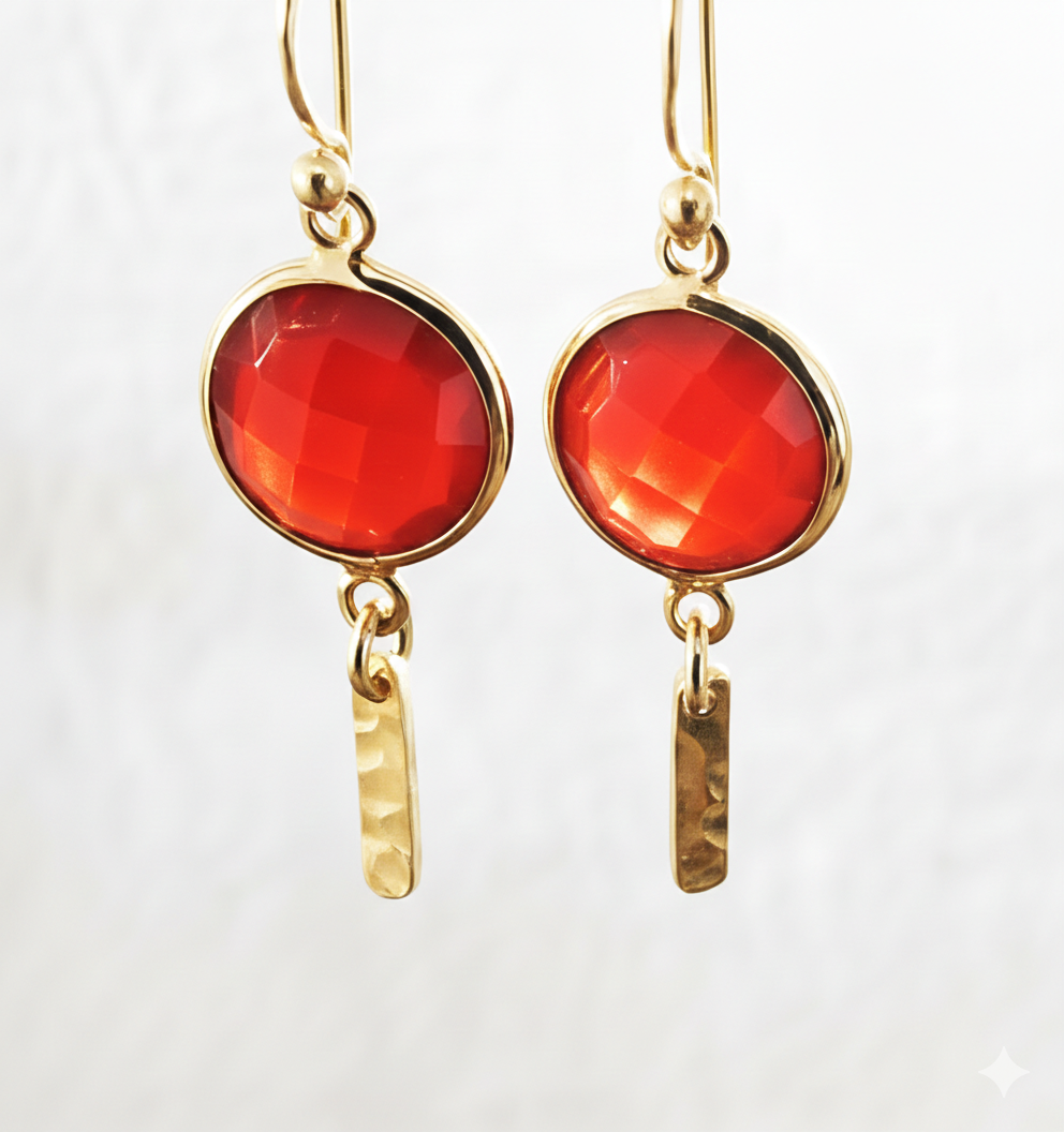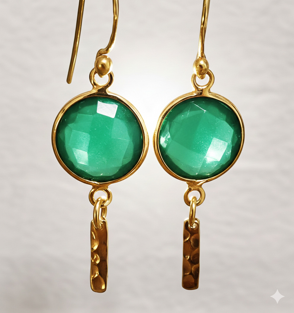 Pendientes modelo isla con cuarzos verde y cornalina, elaborados en plata de ley 925 con chapado en oro 18 quilates. Los cuarzos están facetados y miden 10mm de diámetro, el largo del pendiente es 3,5cm. De la parte inferior de la piedra lleva adornando una lámina rectangular trabajada martelando la plata. Están elaborados artesanalmente.